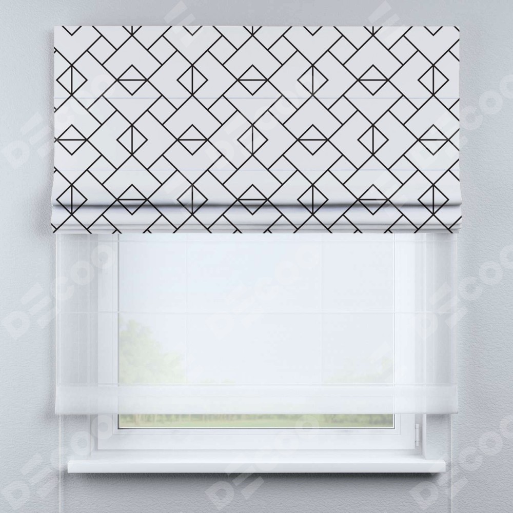 Римская штора день-ночь производителя «Cortin», используется для проёма, пошита из двух полотен, с лицевой блэкаут с нанесением сублимационной печати «Геометрический орнамент», вторая ткань тюль (по стандарту комплектуется тюль белого цвета артикул V-01). Имеет универсальный механизм и подходит для монтажа: на потолок, на стену и в нишу.