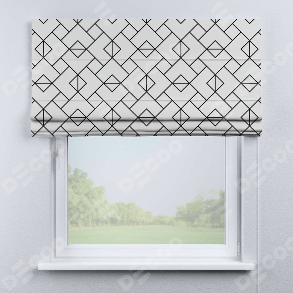 Римская штора производителя «Cortin», используется для проёма, пошита из ткани блэкаут с нанесением сублимационной печати «Геометрический орнамент». Имеет универсальный механизм и подходит для монтажа: на потолок, на стену и в нишу.