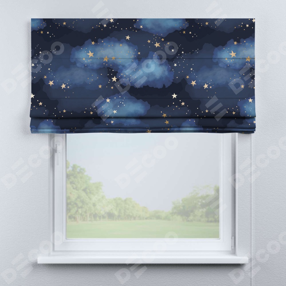 Римская штора производителя «Cortin», используется для проёма, пошита из ткани блэкаут с нанесением сублимационной печати «Золотые звёзды». Имеет универсальный механизм и подходит для монтажа: на потолок, на стену и в нишу.