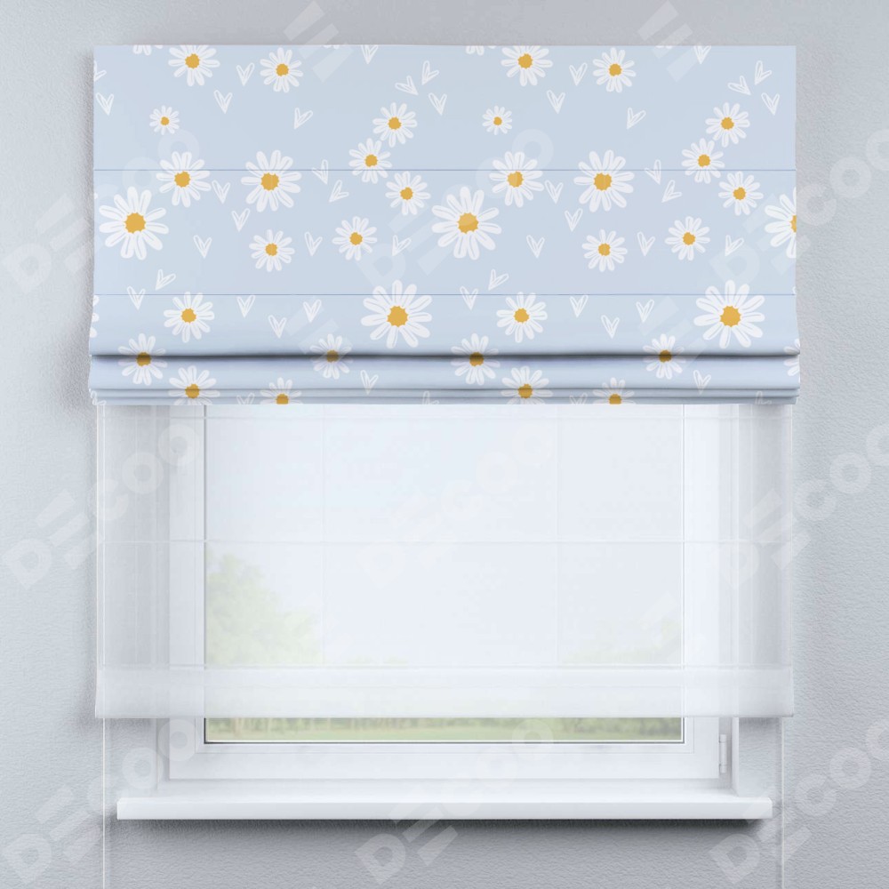 Римская штора день-ночь производителя «Cortin», используется для проёма, пошита из двух полотен, с лицевой блэкаут с нанесением сублимационной печати «Летние ромашки», вторая ткань тюль (по стандарту комплектуется тюль белого цвета артикул V-01). Имеет универсальный механизм и подходит для монтажа: на потолок, на стену и в нишу.