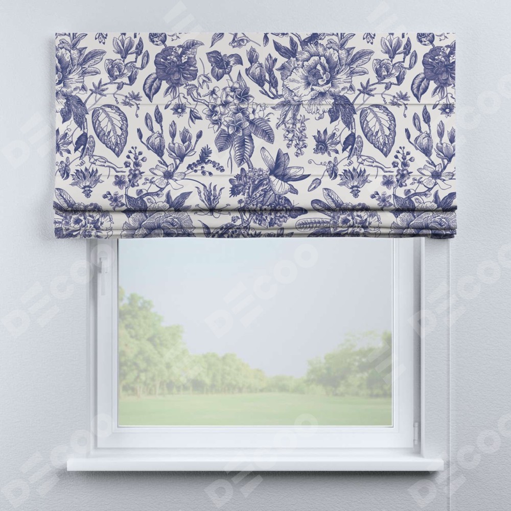 Римская штора производителя «Cortin», используется для проёма, пошита из ткани блэкаут с нанесением сублимационной печати «Прованс в синем». Имеет универсальный механизм и подходит для монтажа: на потолок, на стену и в нишу.