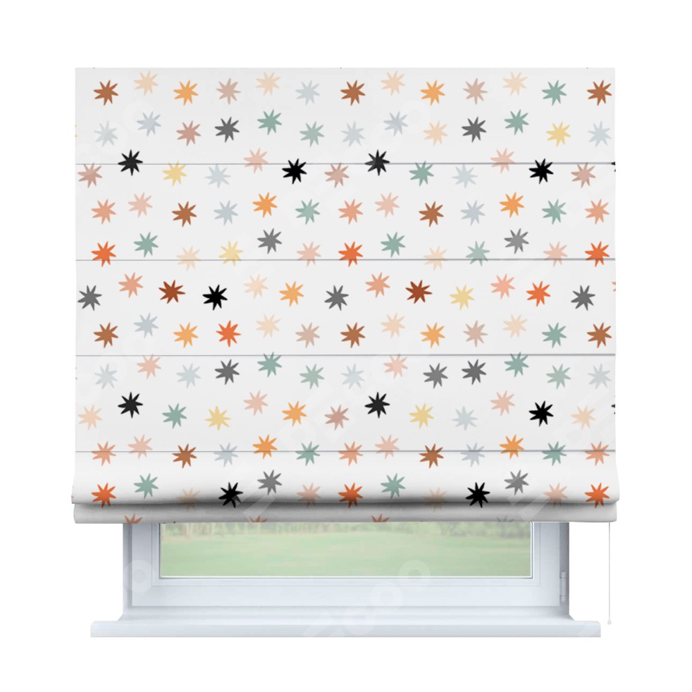 Римская штора производителя «Cortin», используется для проёма, пошита из ткани блэкаут с нанесением сублимационной печати «Разноцветные звёзды». Имеет универсальный механизм и подходит для монтажа: на потолок, на стену и в нишу.