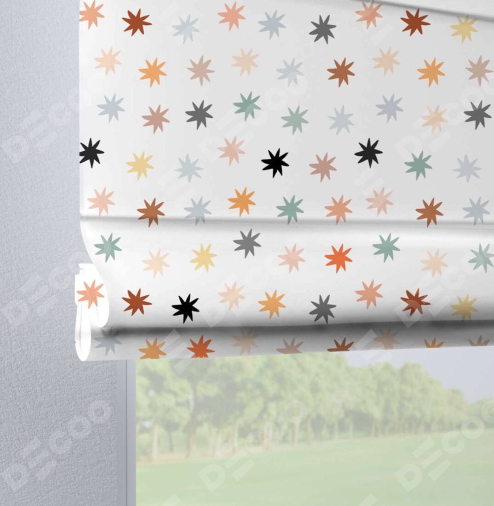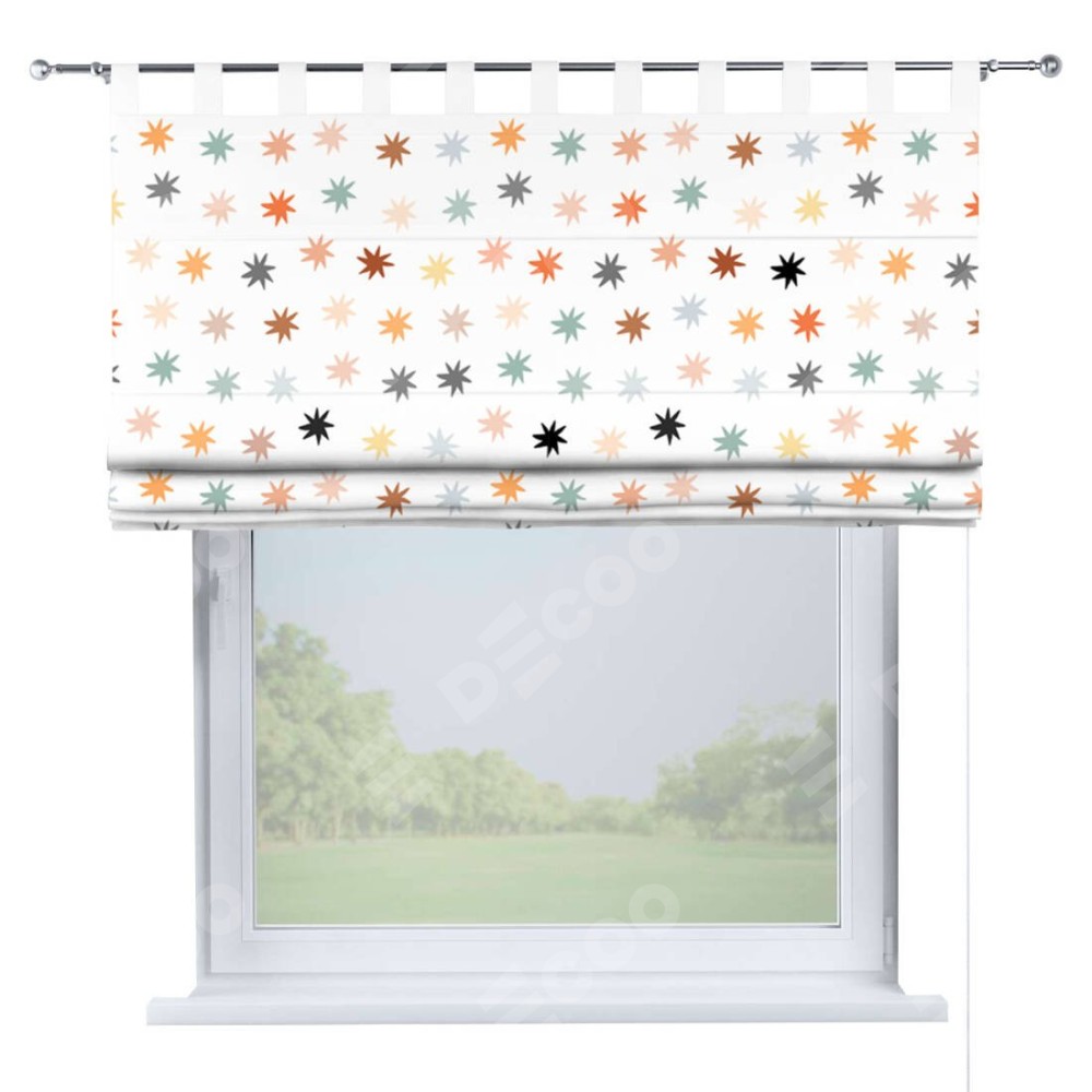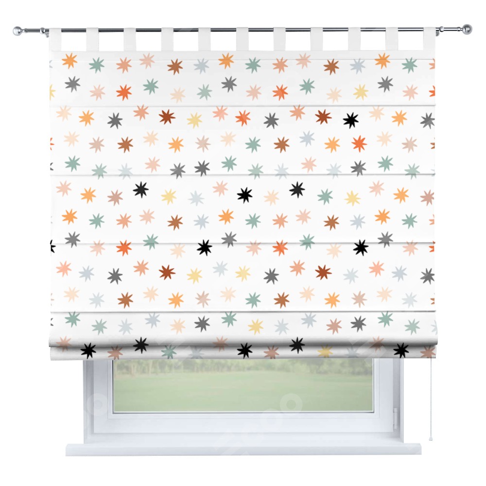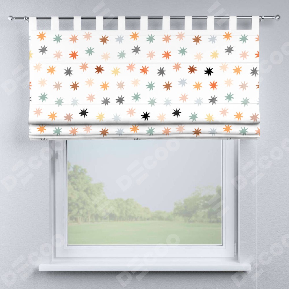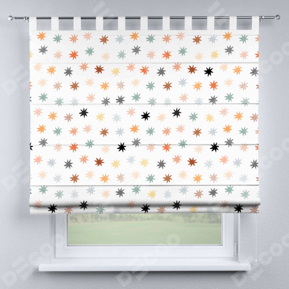 Римская штора производителя «Cortin», используется для проёма, пошита из ткани блэкаут с нанесением сублимационной печати «Разноцветные звёзды». Данная модель пошита на петлях, комплектуется на выбор круглым карнизом и подходит для монтажа на стену. Римская штора на петлях имеет простую систему регулировки высоты, отличительным преимуществом данной модели является простой способ монтажа. Достаточно повесить ее на трубу и штора готова!