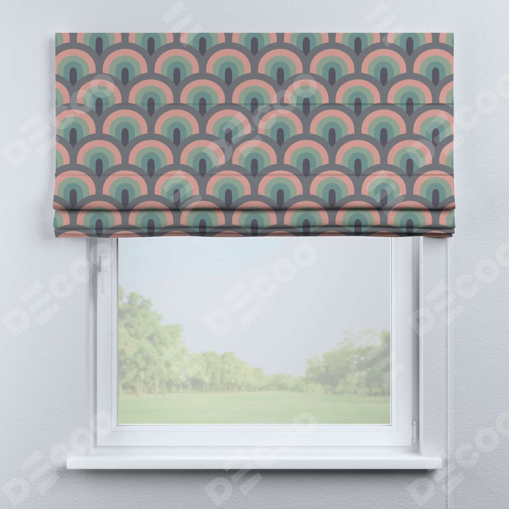 Римская штора производителя «Cortin», используется для проёма, пошита из ткани блэкаут с нанесением сублимационной печати «Ретро орнамент». Имеет универсальный механизм и подходит для монтажа: на потолок, на стену и в нишу.