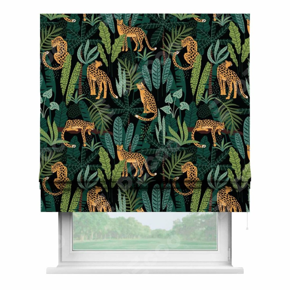 Римская штора производителя «Cortin», используется для проёма, пошита из ткани блэкаут с нанесением сублимационной печати «Леопарды в джунглях». Имеет универсальный механизм и подходит для монтажа: на потолок, на стену и в нишу.