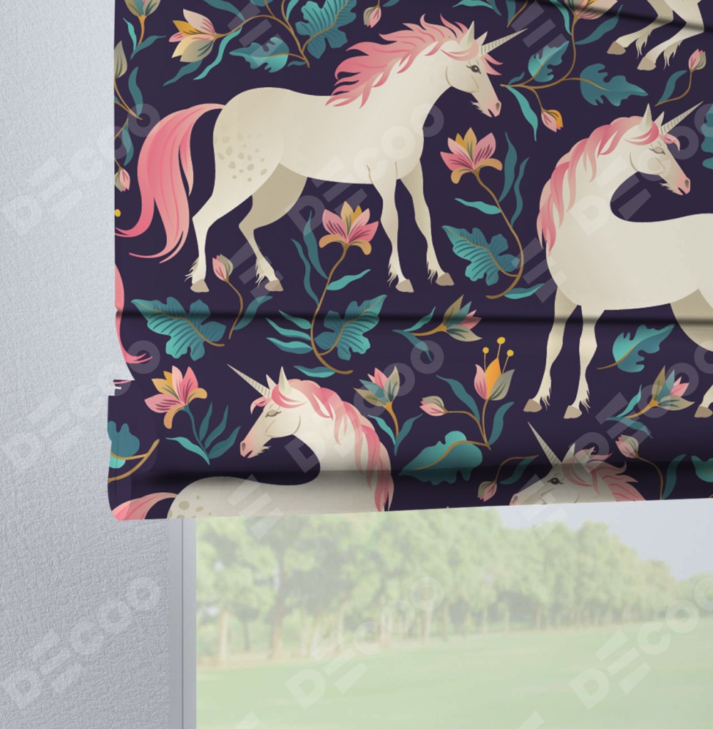 Римская штора производителя «Cortin», используется для проёма, пошита из ткани блэкаут с нанесением сублимационной печати «Сказочные единороги». Данная модель пошита на петлях, комплектуется на выбор круглым карнизом и подходит для монтажа на стену. Римская штора на петлях имеет простую систему регулировки высоты, отличительным преимуществом данной модели является простой способ монтажа. Достаточно повесить ее на трубу и штора готова!