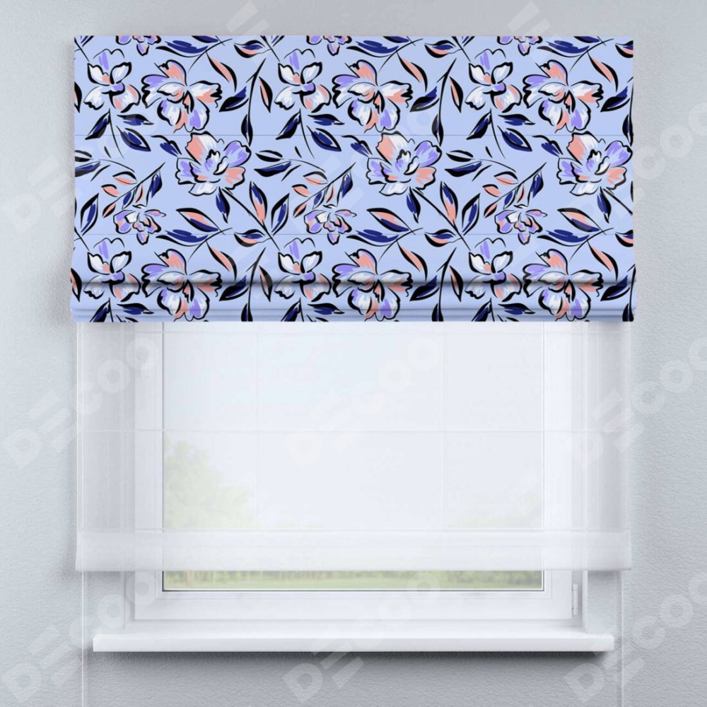 Римская штора день-ночь производителя «Cortin», используется для проёма, пошита из двух полотен, с лицевой блэкаут с нанесением сублимационной печати «Цветочки и листочки», вторая ткань тюль (по стандарту комплектуется тюль белого цвета артикул V-01). Имеет универсальный механизм и подходит для монтажа: на потолок, на стену и в нишу.