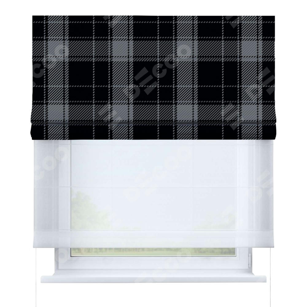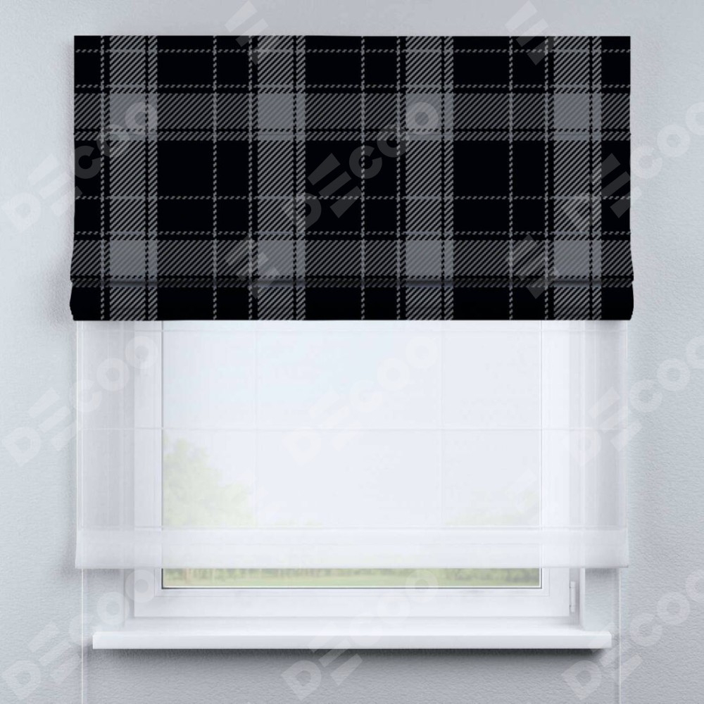 Римская штора день-ночь производителя «Cortin», используется для проёма, пошита из двух полотен, с лицевой блэкаут с нанесением сублимационной печати «Стильная клетка», вторая ткань тюль (по стандарту комплектуется тюль белого цвета артикул V-01). Имеет универсальный механизм и подходит для монтажа: на потолок, на стену и в нишу.