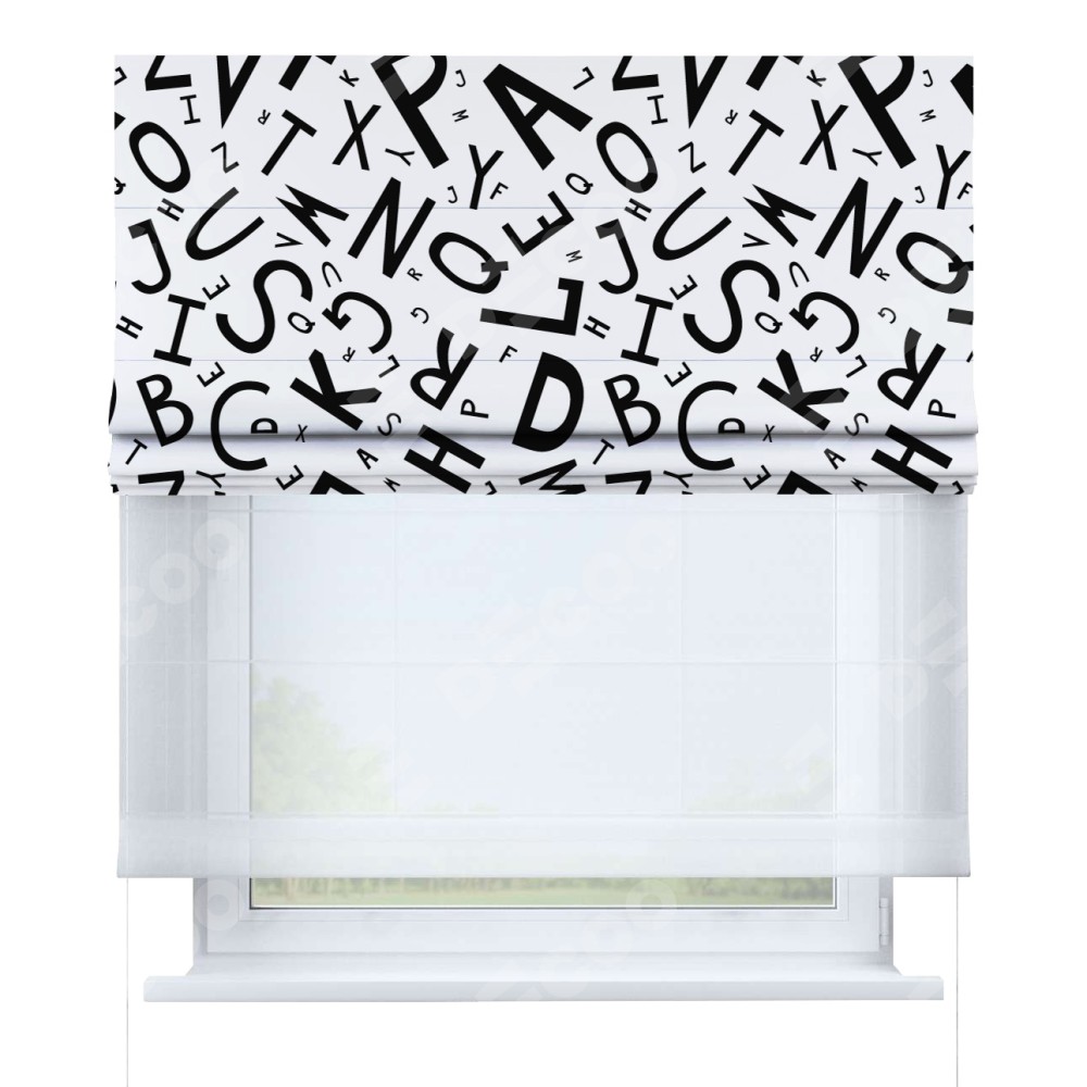 Римская штора день-ночь производителя «Cortin», используется для проёма, пошита из двух полотен, с лицевой блэкаут с нанесением сублимационной печати «Литеры на белом», вторая ткань тюль (по стандарту комплектуется тюль белого цвета артикул V-01). Имеет универсальный механизм и подходит для монтажа: на потолок, на стену и в нишу.