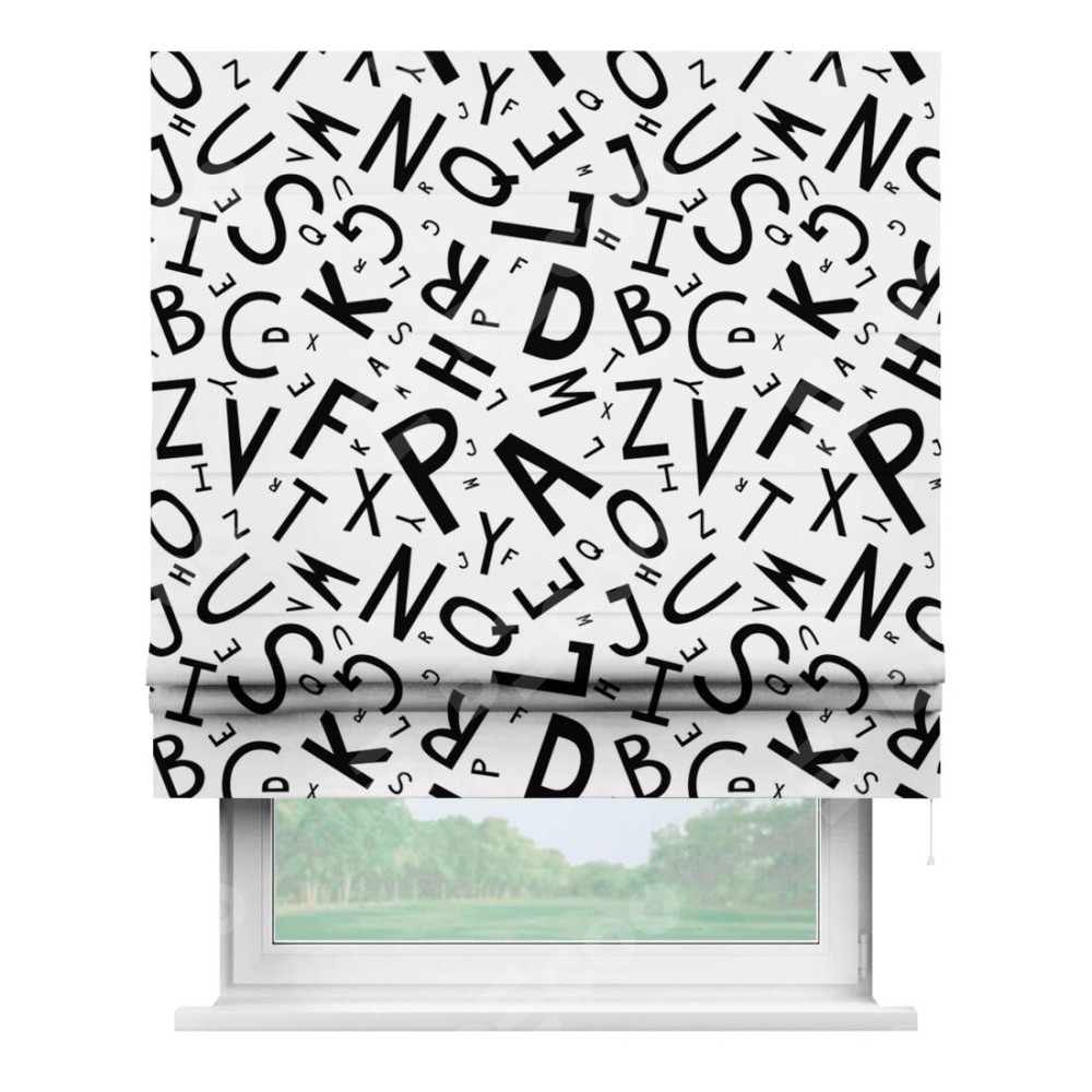 Римская штора производителя «Cortin», используется для проёма, пошита из ткани блэкаут с нанесением сублимационной печати «Литеры на белом». Имеет универсальный механизм и подходит для монтажа: на потолок, на стену и в нишу.