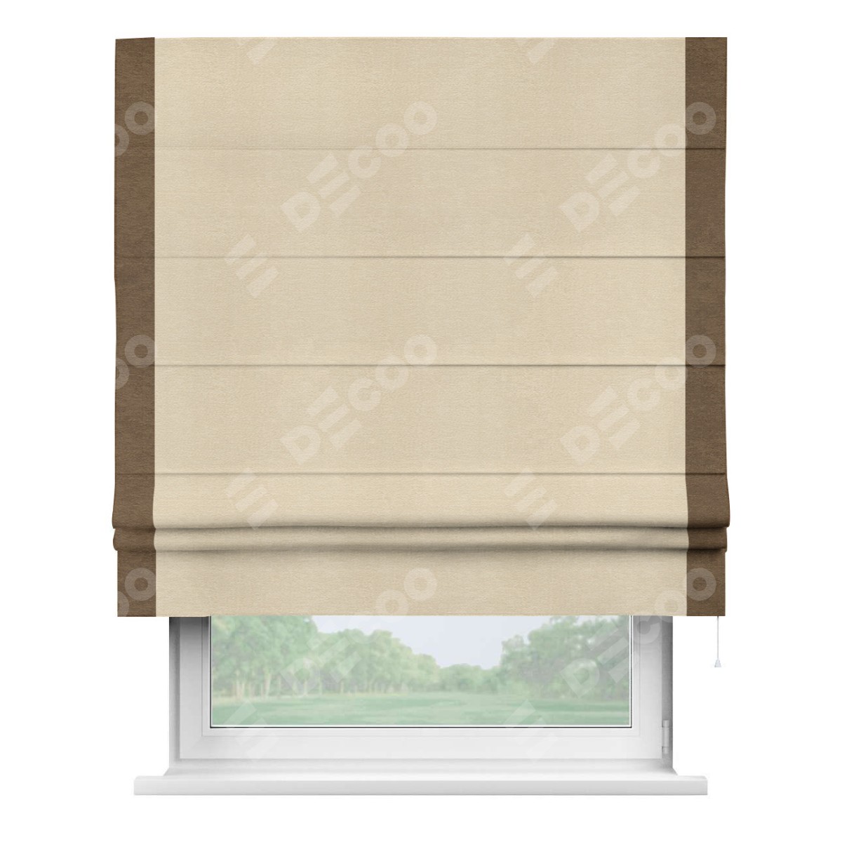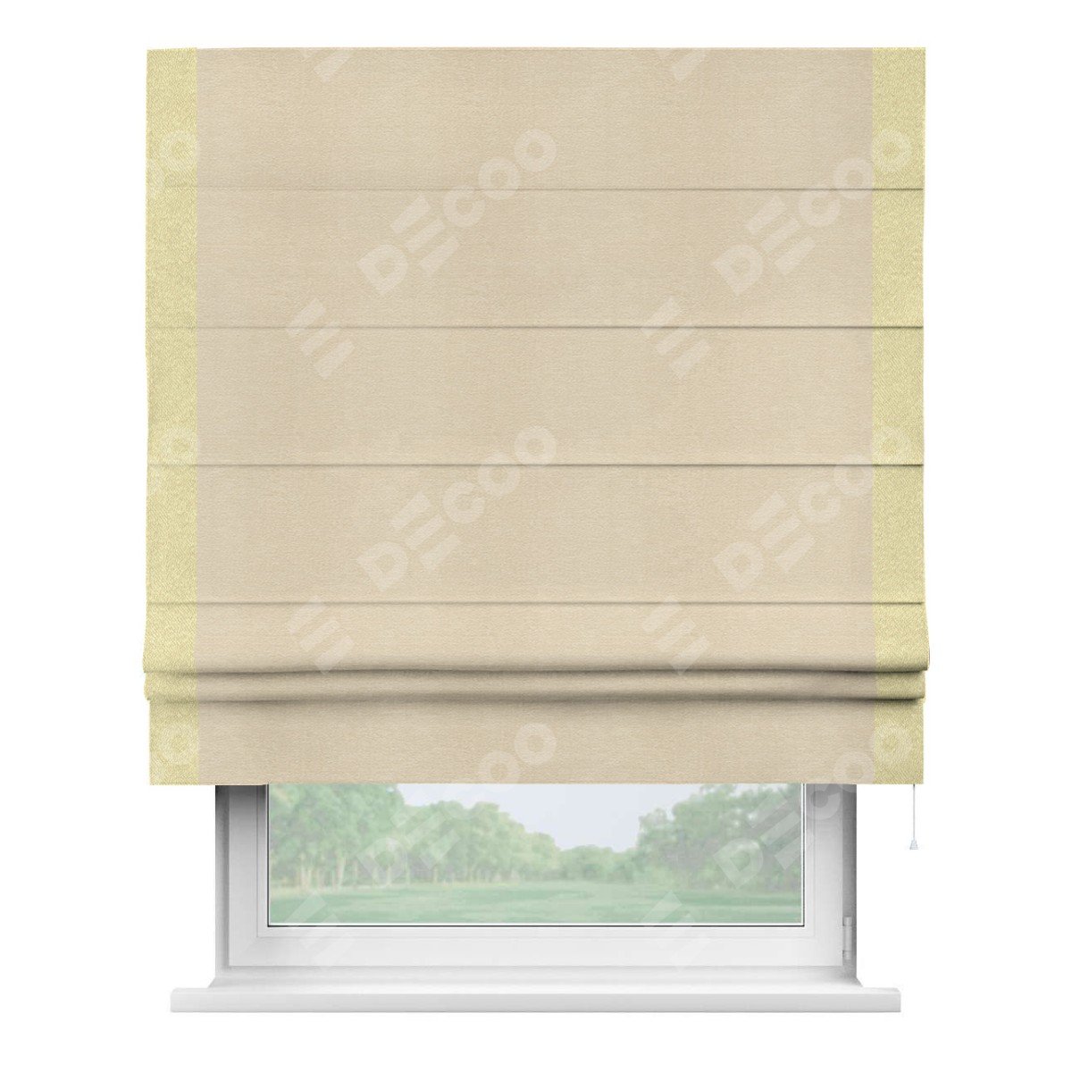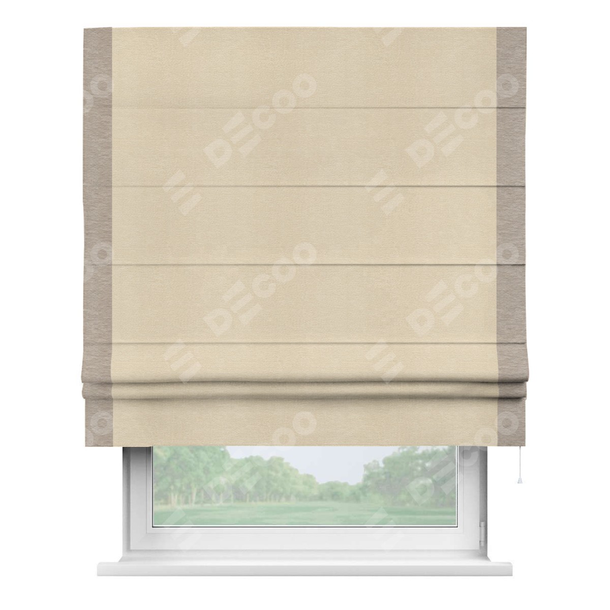 Римская штора производителя «Cortin», используется для проёма, пошита из ткани софт однотонный бежевый лайт, артикул 33100. Отделка шторы кантом «Стрим Дуо», ткань для канта используется из софта разной расцветки на выбор. Имеет универсальный механизм и подходит для монтажа: на потолок, на стену и в нишу.