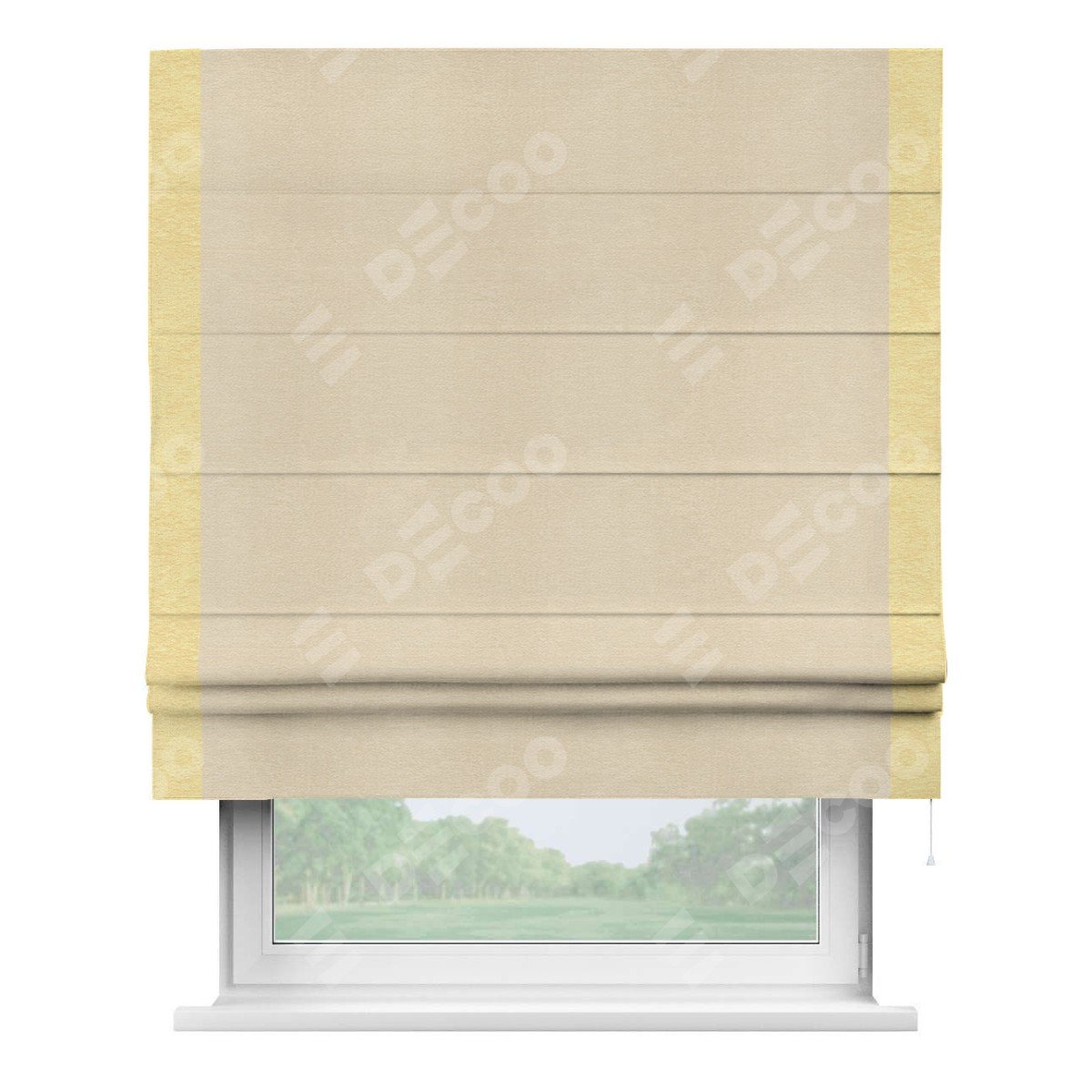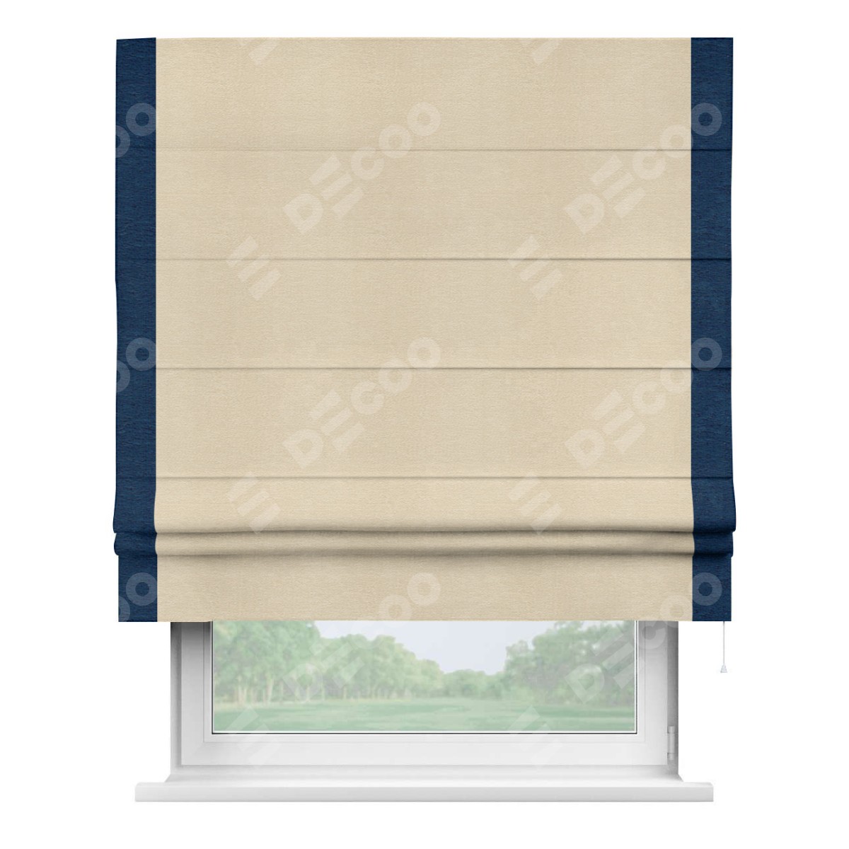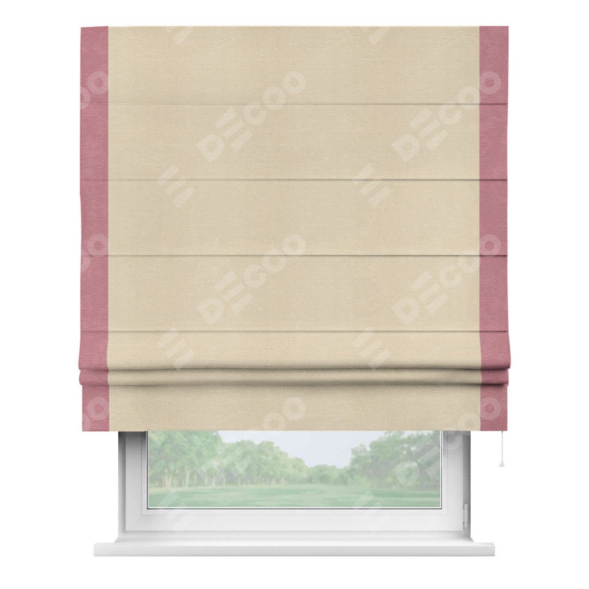 Римская штора производителя «Cortin», используется для проёма, пошита из ткани софт однотонный бежевый лайт, артикул 33100. Отделка шторы кантом «Стрим Дуо», ткань для канта используется из софта разной расцветки на выбор. Имеет универсальный механизм и подходит для монтажа: на потолок, на стену и в нишу.