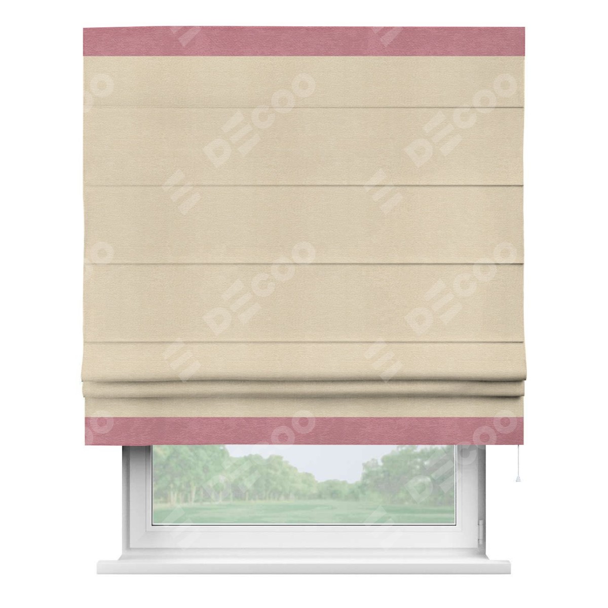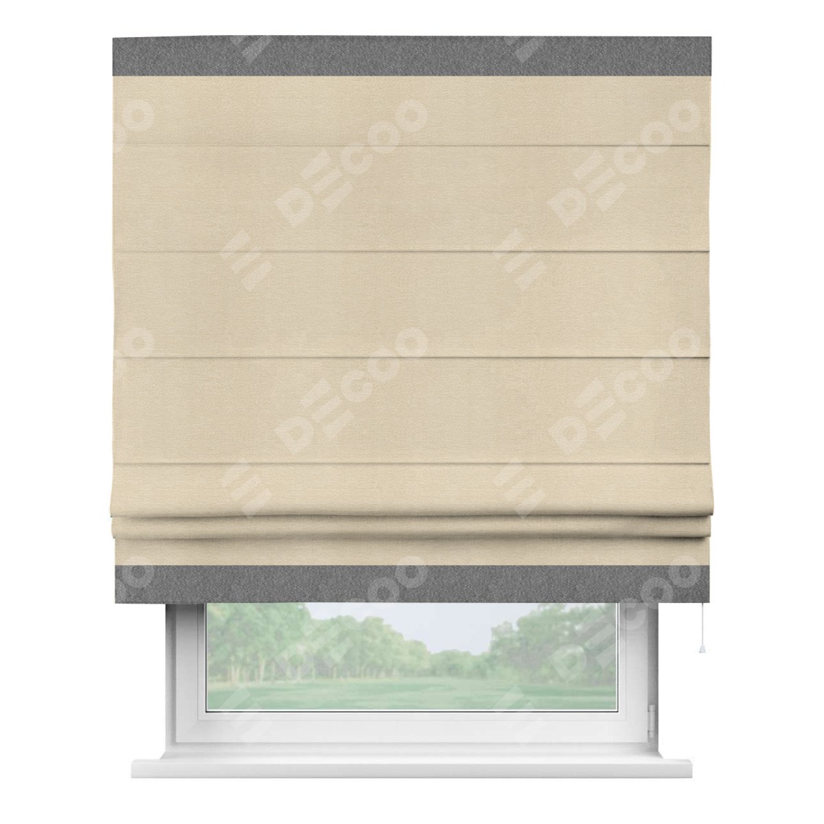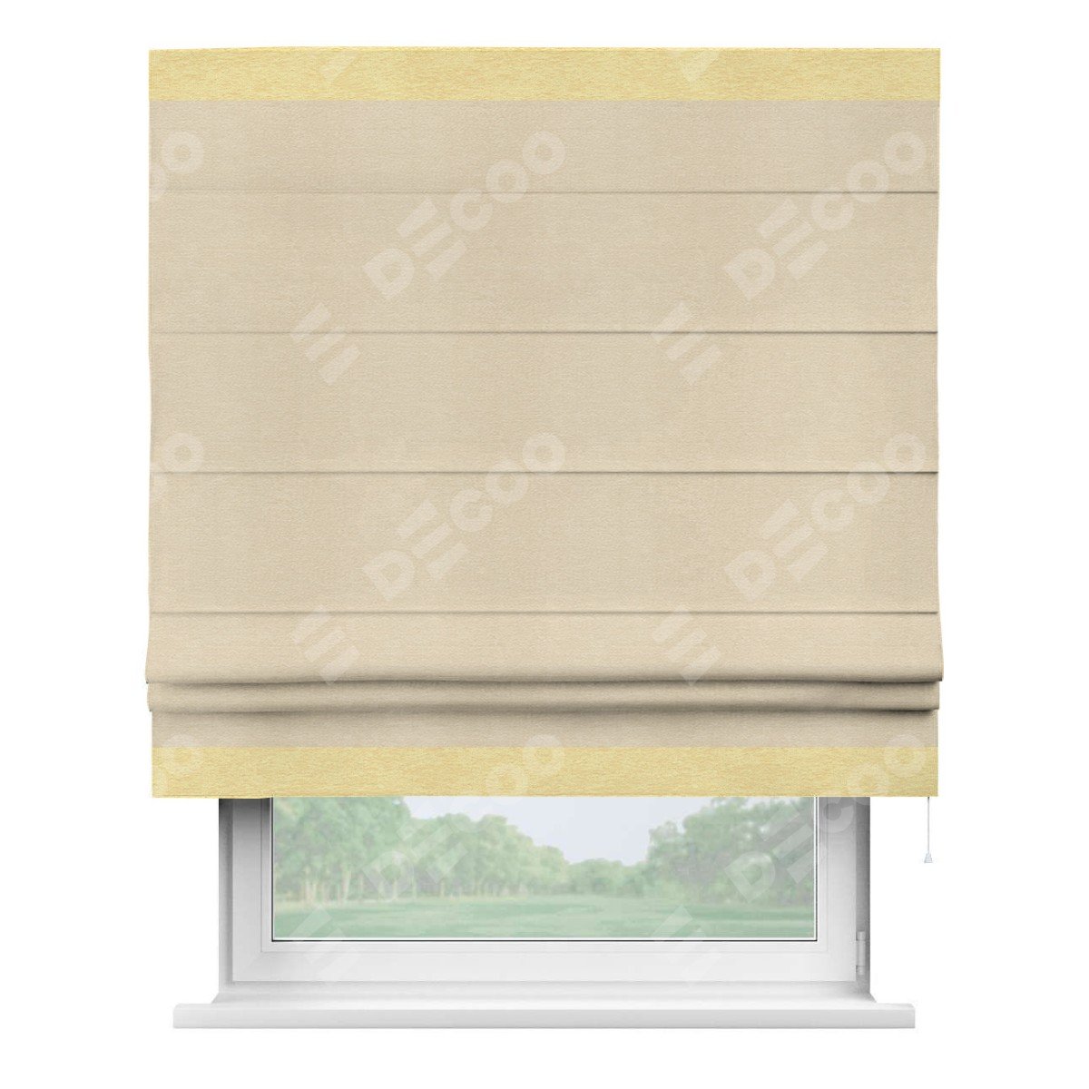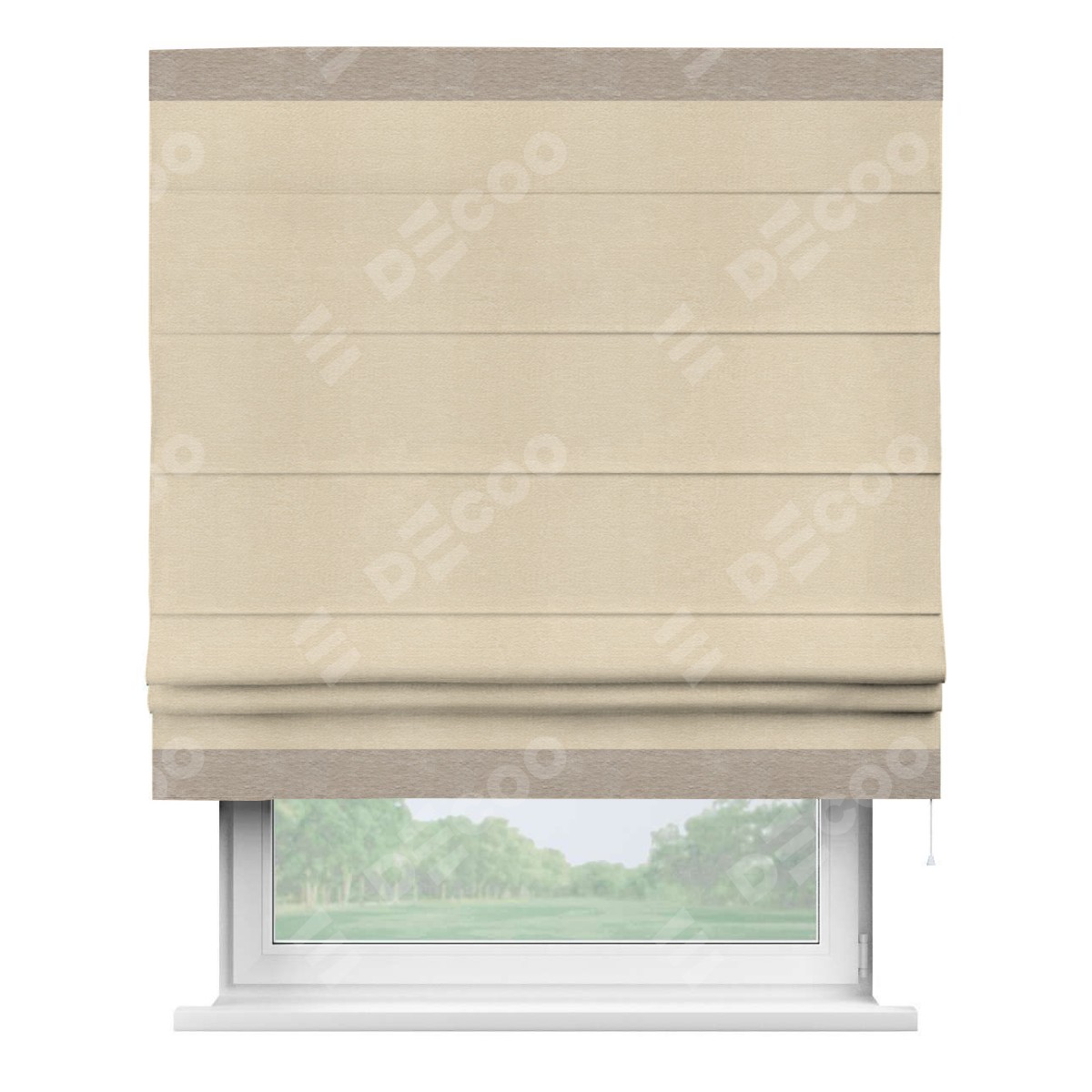 Римская штора производителя «Cortin», используется для проёма, пошита из ткани софт однотонный бежевый лайт, артикул 33100. Отделка шторы кантом «Горизонт», ткань для канта используется из софта разной расцветки на выбор. Имеет универсальный механизм и подходит для монтажа: на потолок, на стену и в нишу.