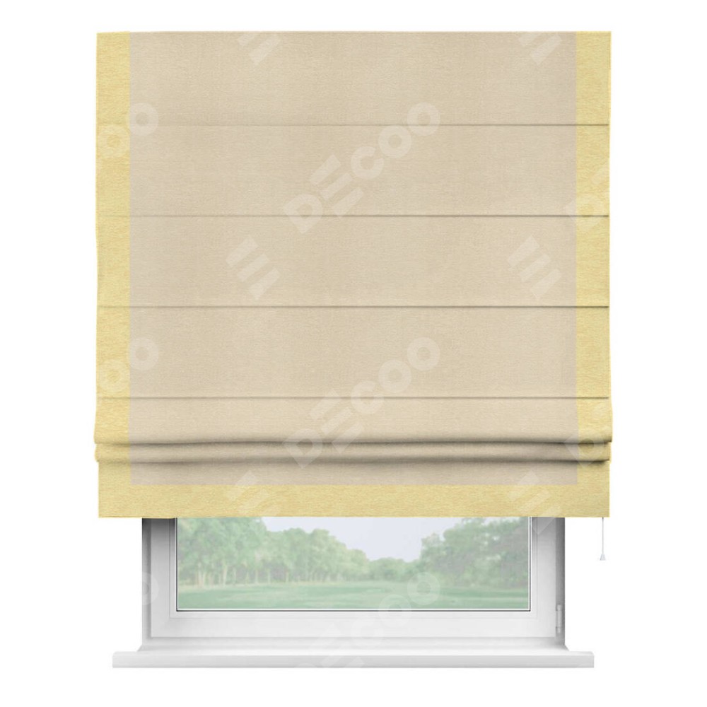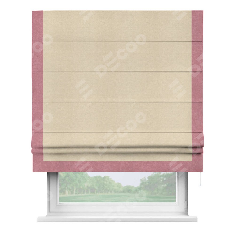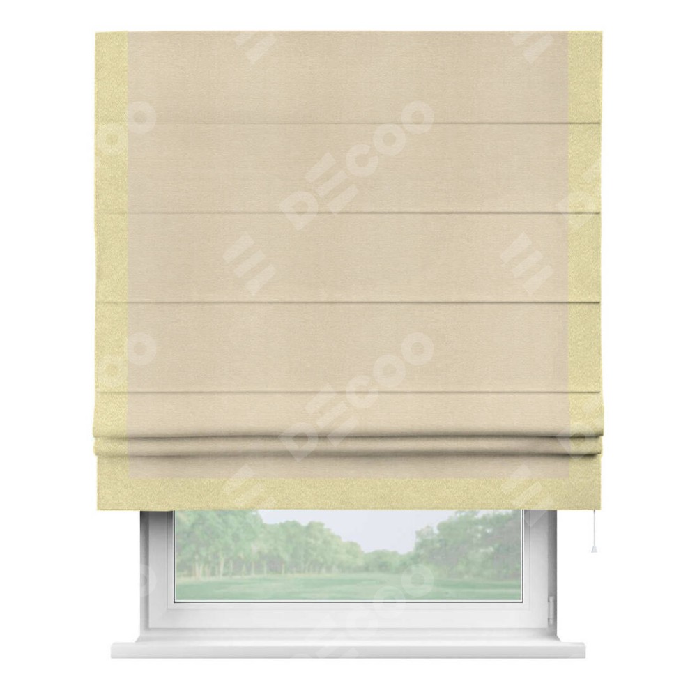 Римская штора производителя «Cortin», используется для проёма, пошита из ткани софт однотонный бежевый лайт, артикул 33100. Отделка шторы кантом «Виктория», ткань для канта используется из софта разной расцветки на выбор. Имеет универсальный механизм и подходит для монтажа: на потолок, на стену и в нишу.