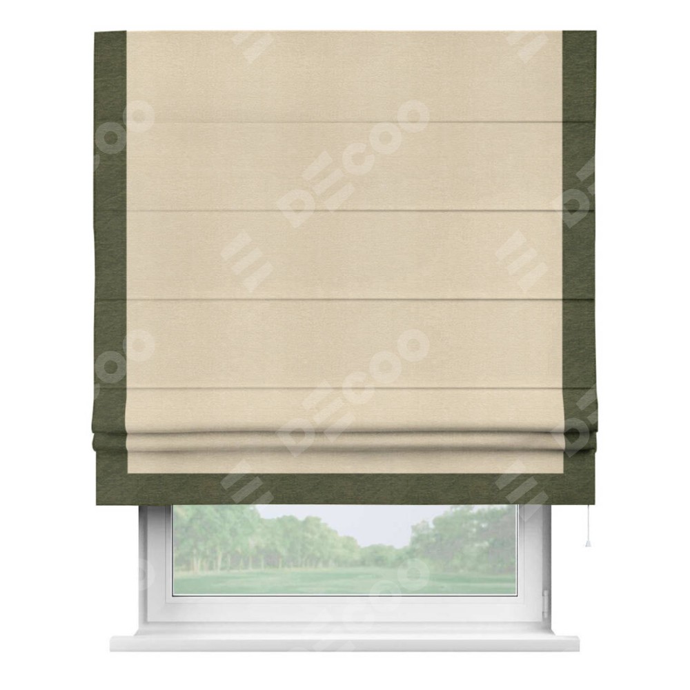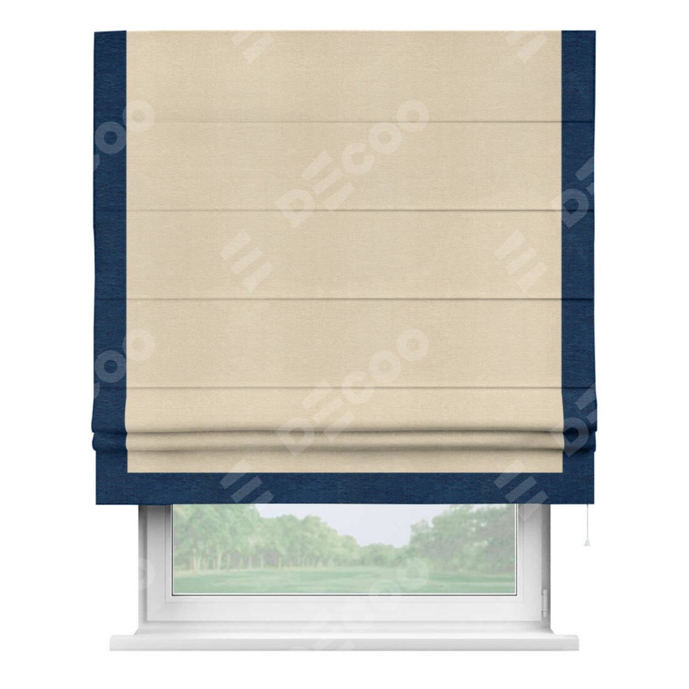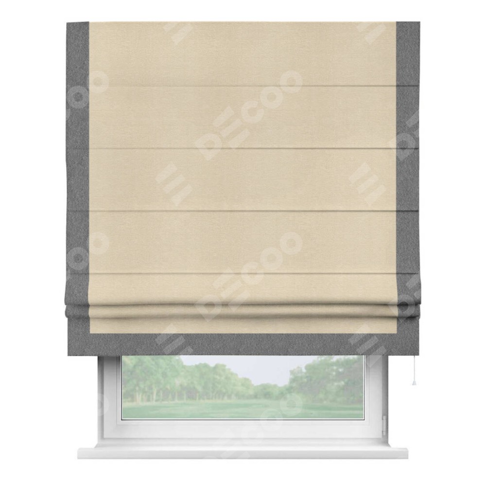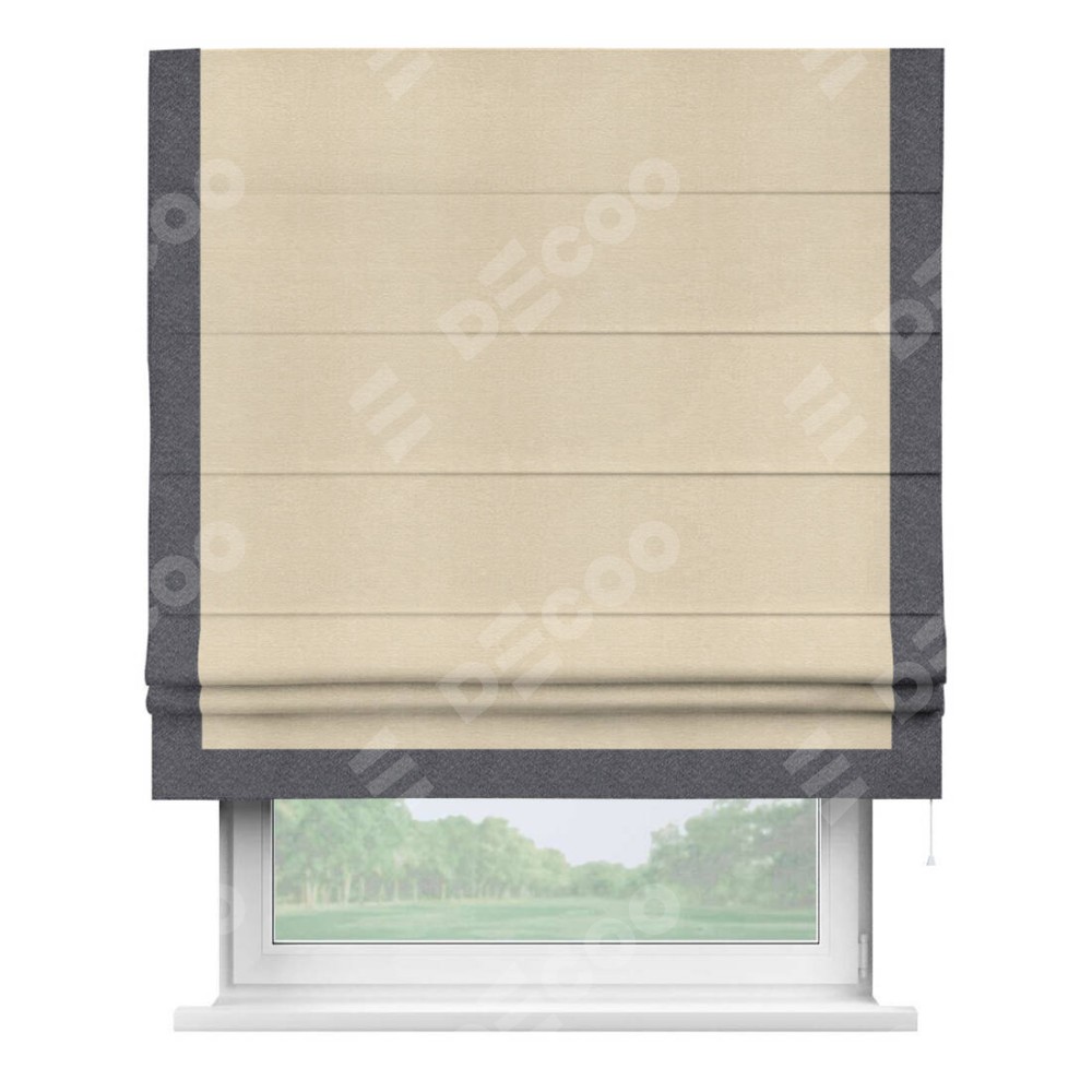 Римская штора производителя «Cortin», используется для проёма, пошита из ткани софт однотонный бежевый лайт, артикул 33100. Отделка шторы кантом «Виктория», ткань для канта используется из софта разной расцветки на выбор. Имеет универсальный механизм и подходит для монтажа: на потолок, на стену и в нишу.