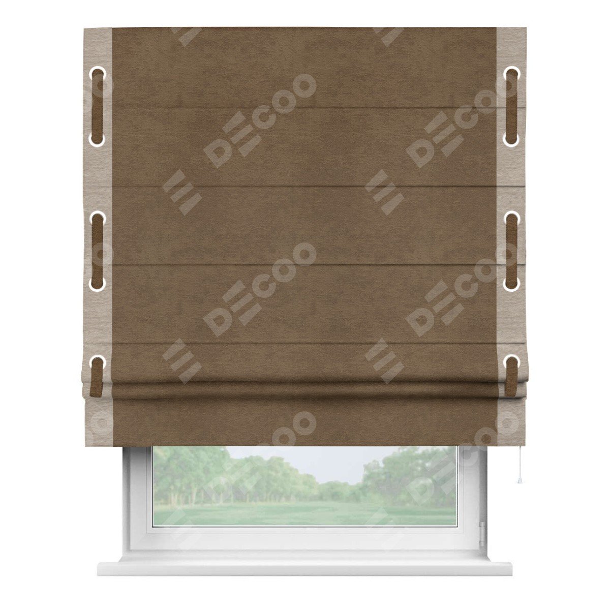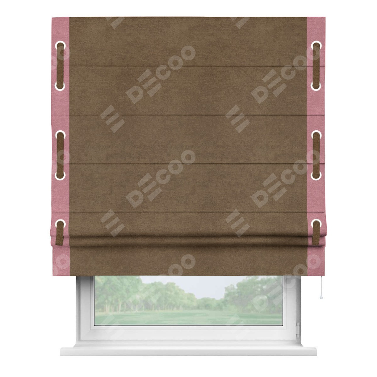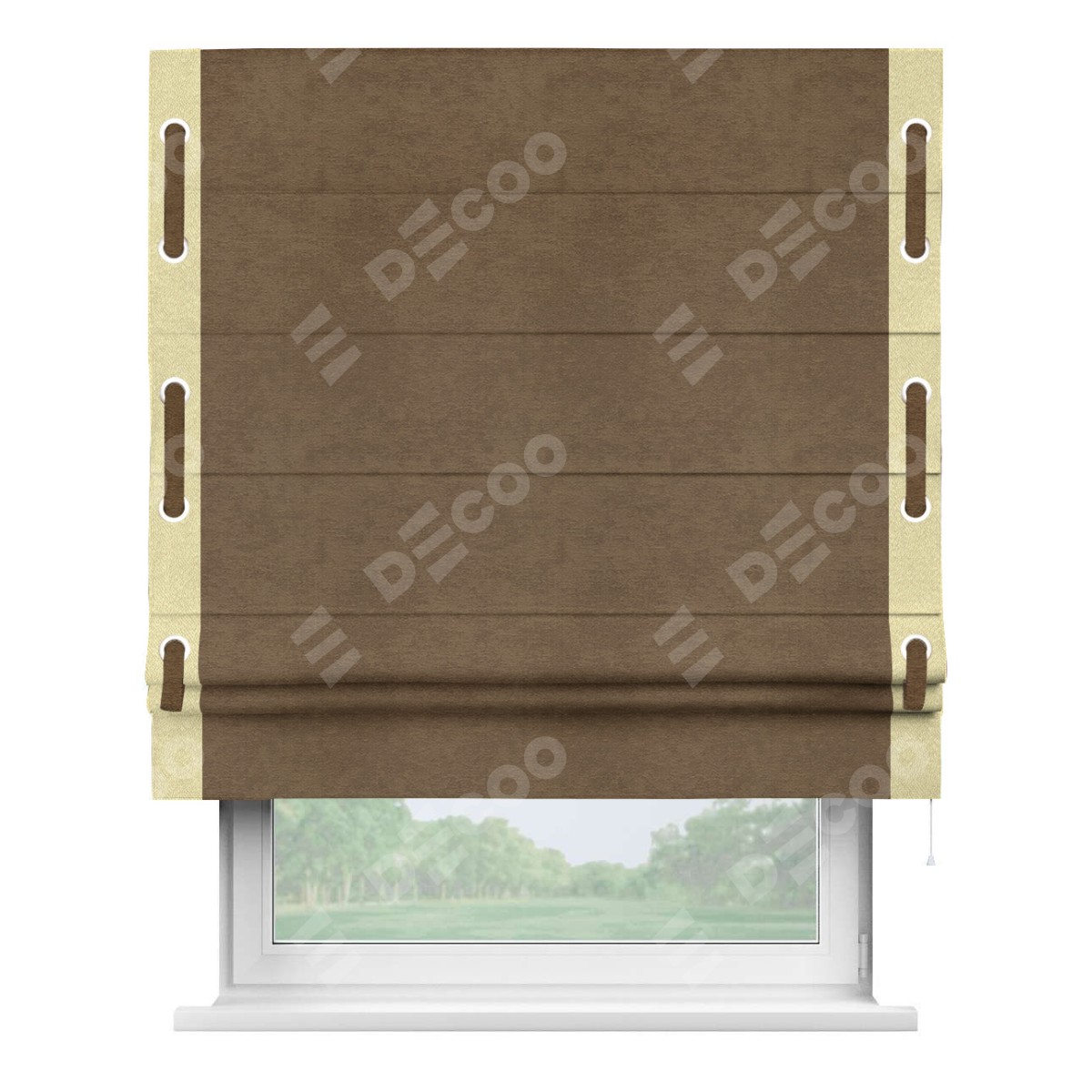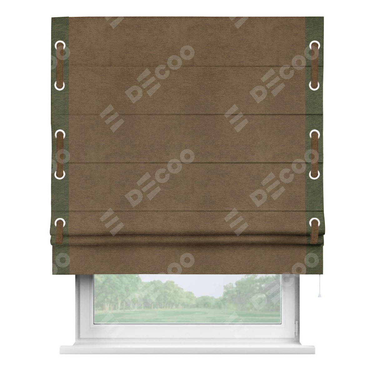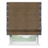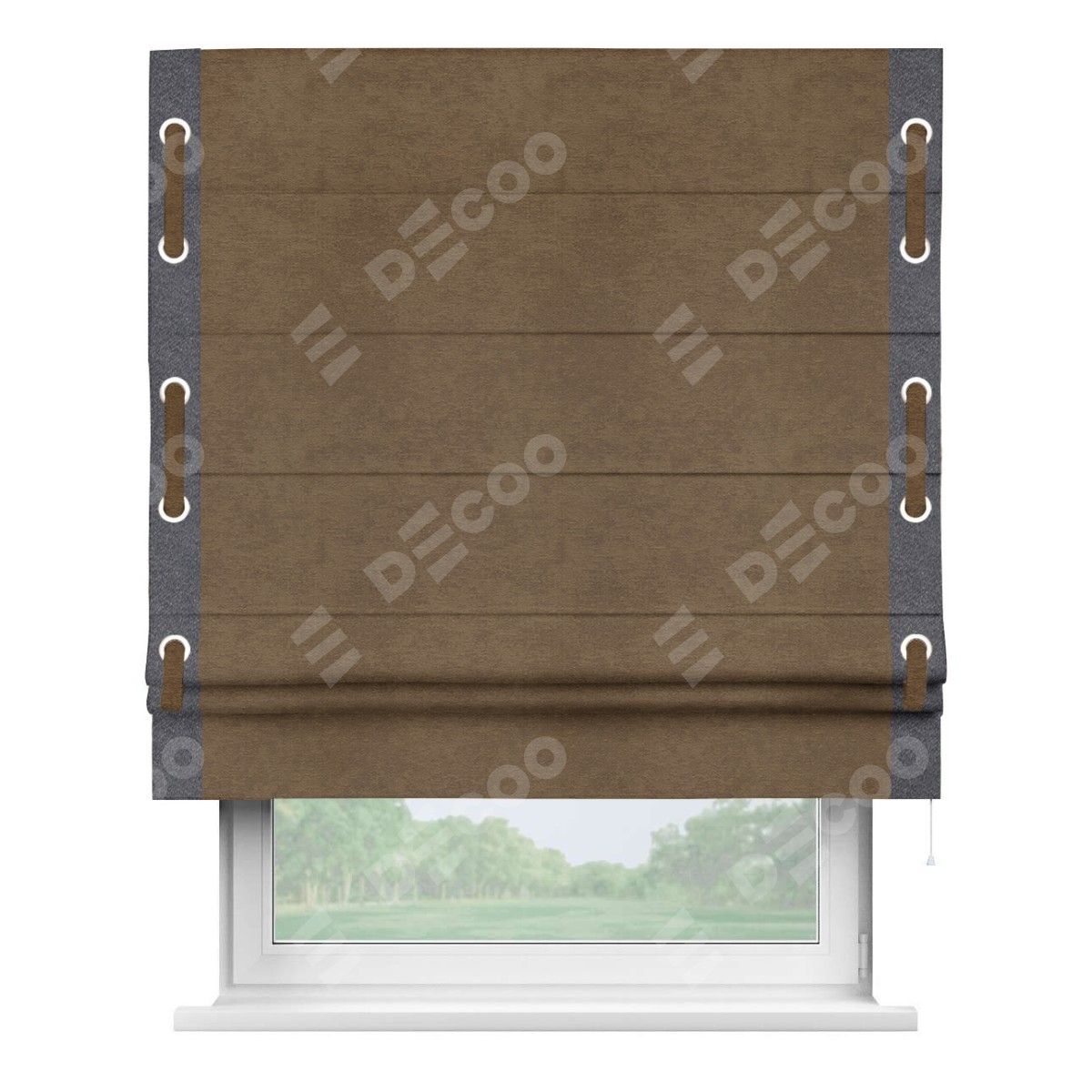 Римская штора производителя «Cortin», используется для проёма, пошита из ткани софт однотонный бронзовый, артикул 33099. Отделка шторы кантом «Стрим Дуо» на кантах расположены люверсы с пояском, ткань для канта используется из софта разной расцветки на выбор. Ткань для пояска обычно используется из основной ткани шторы, а так же можно сделать из любой расцветки по желанию. Имеет универсальный механизм и подходит для монтажа: на потолок, на стену и в нишу.