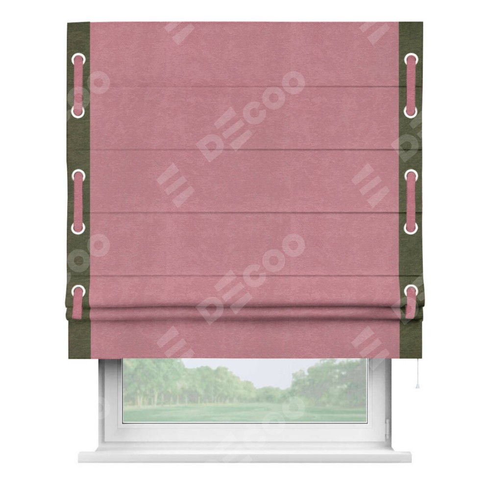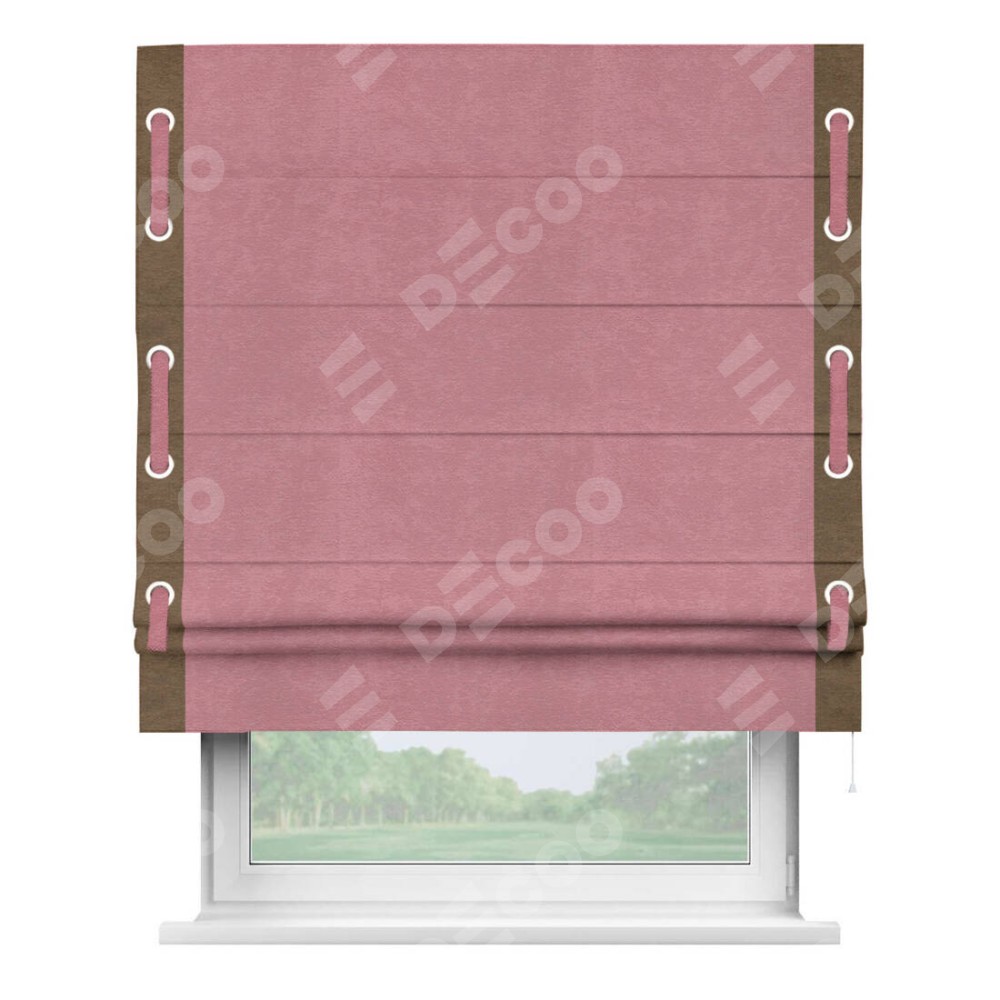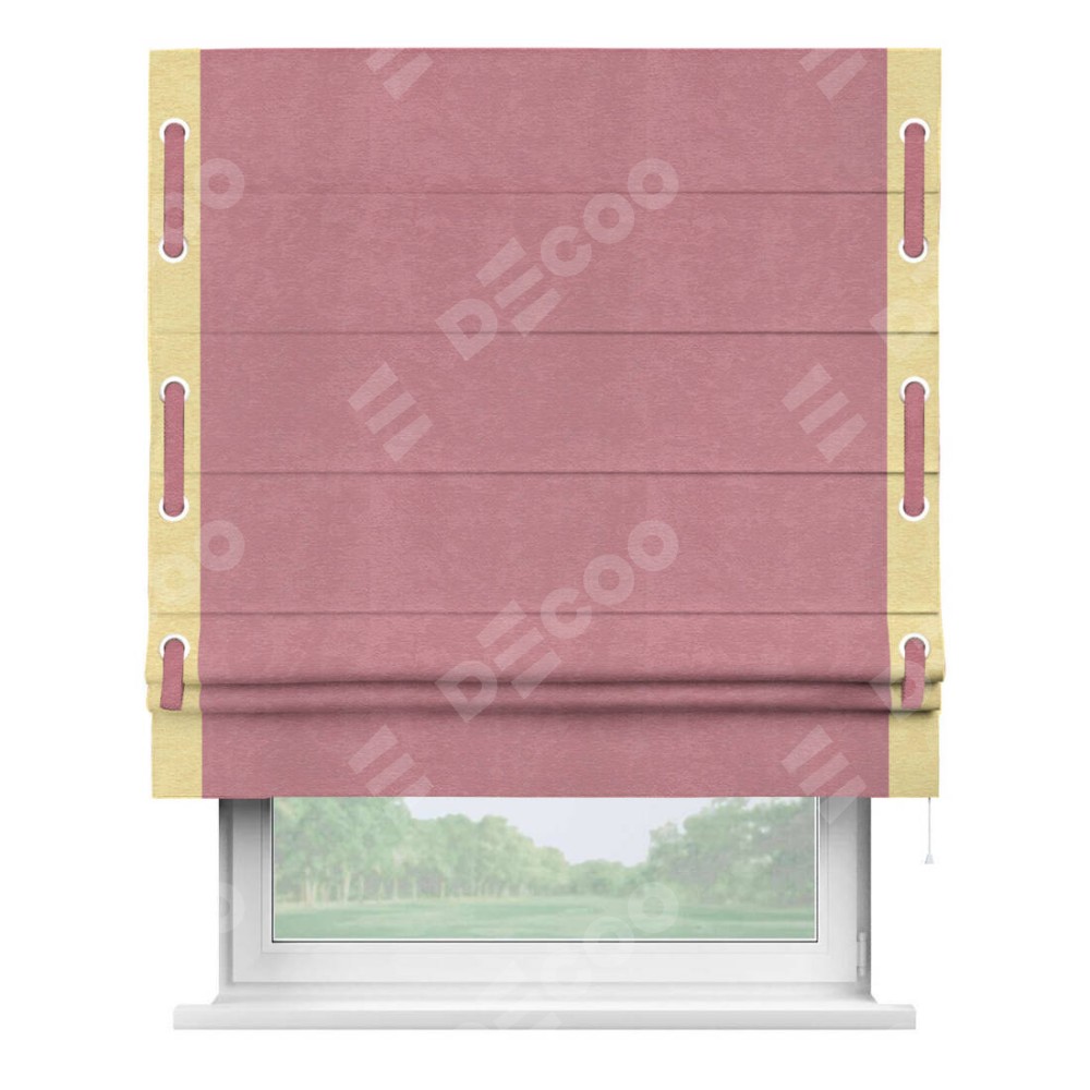 Римская штора производителя «Cortin», используется для проёма, пошита из ткани софт однотонный розовый, артикул 42926. Отделка шторы кантом «Стрим Дуо» на кантах расположены люверсы с пояском, ткань для канта используется из софта разной расцветки на выбор. Ткань для пояска обычно используется из основной ткани шторы, а так же можно сделать из любой расцветки по желанию. Имеет универсальный механизм и подходит для монтажа: на потолок, на стену и в нишу.
