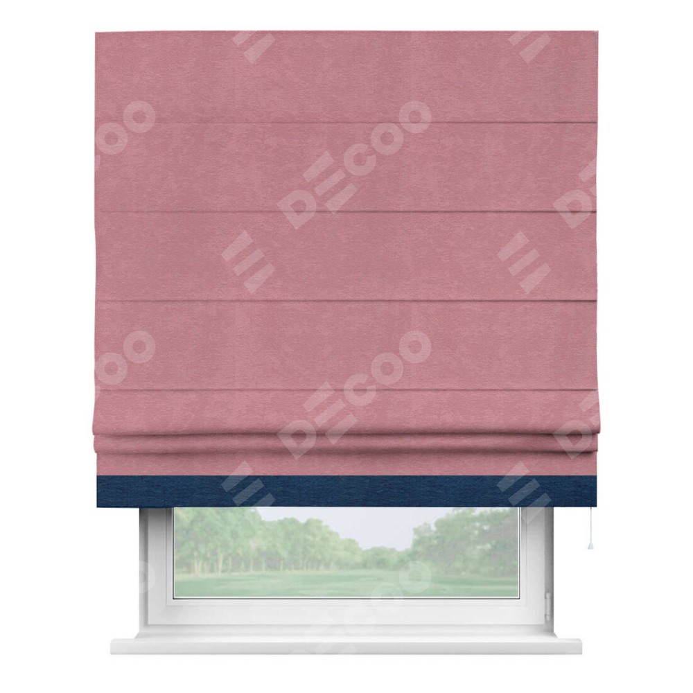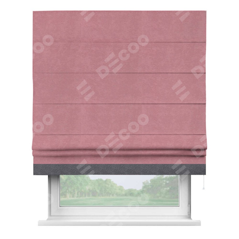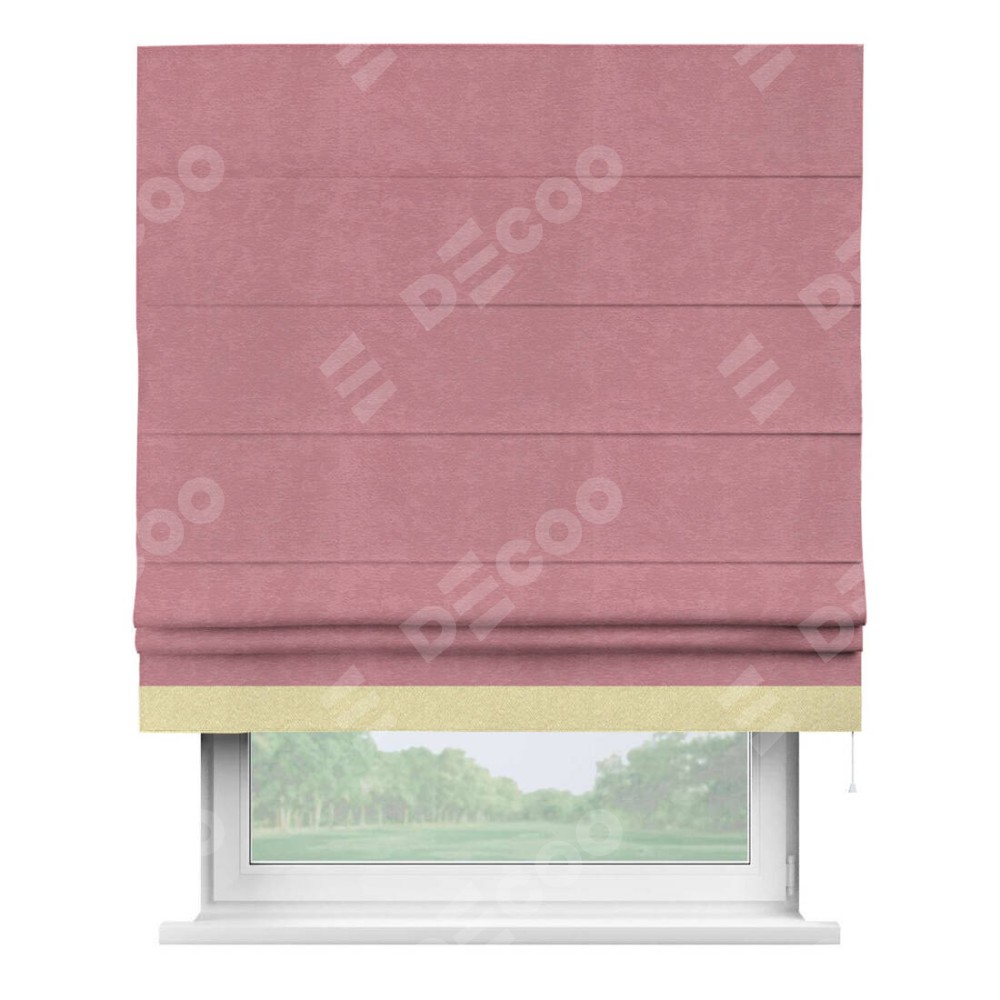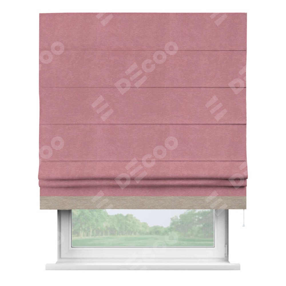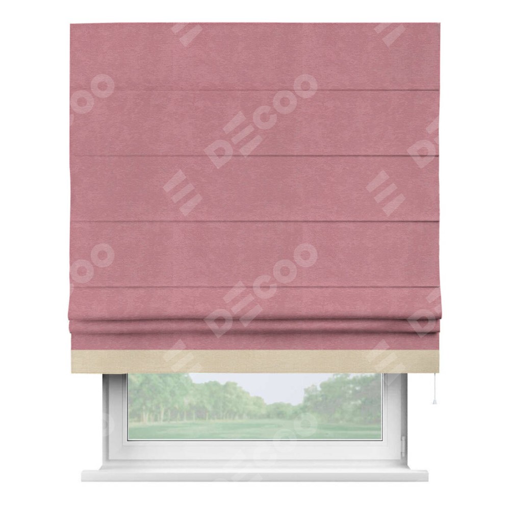 Римская штора производителя «Cortin», используется для проёма, пошита из ткани софт однотонный розовый, артикул 42926. Отделка шторы кантом «Джестер», ткань для канта используется из софта разной расцветки на выбор. Имеет универсальный механизм и подходит для монтажа: на потолок, на стену и в нишу.