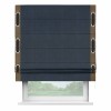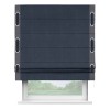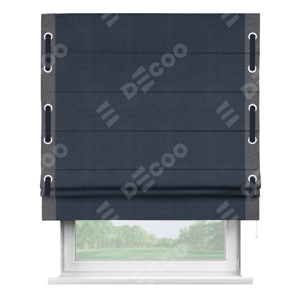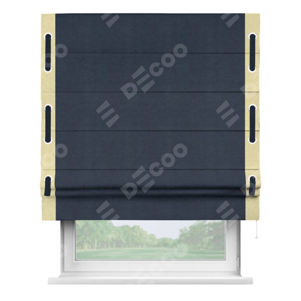Римская штора производителя «Cortin», используется для проёма, пошита из ткани софт однотонный тёмно-синий, артикул 33111. Отделка шторы кантом «Стрим Дуо» на кантах расположены люверсы с пояском, ткань для канта используется из софта разной расцветки на выбор. Ткань для пояска обычно используется из основной ткани шторы, а так же можно сделать из любой расцветки по желанию. Имеет универсальный механизм и подходит для монтажа: на потолок, на стену и в нишу.