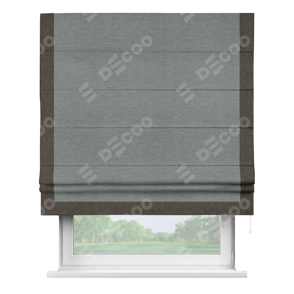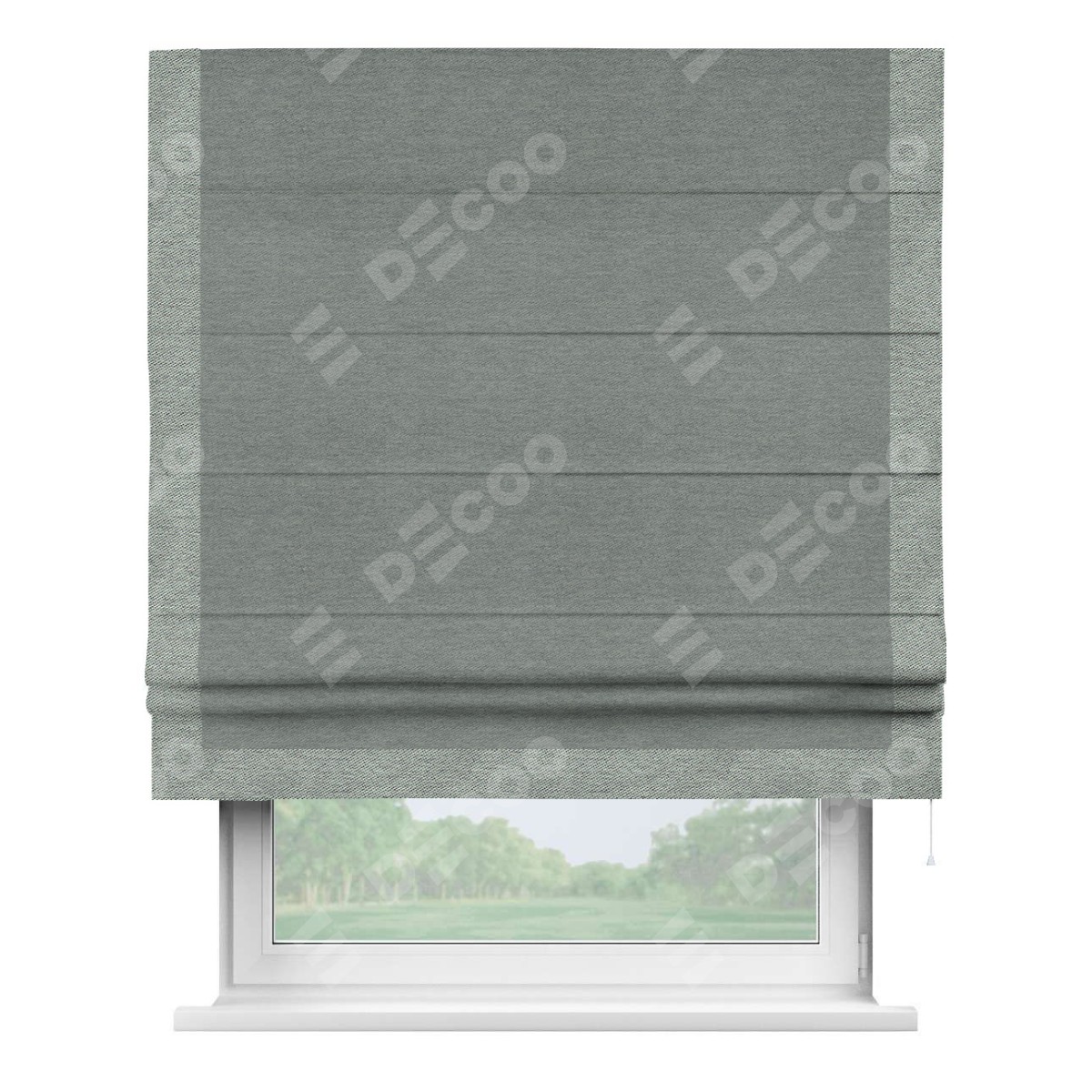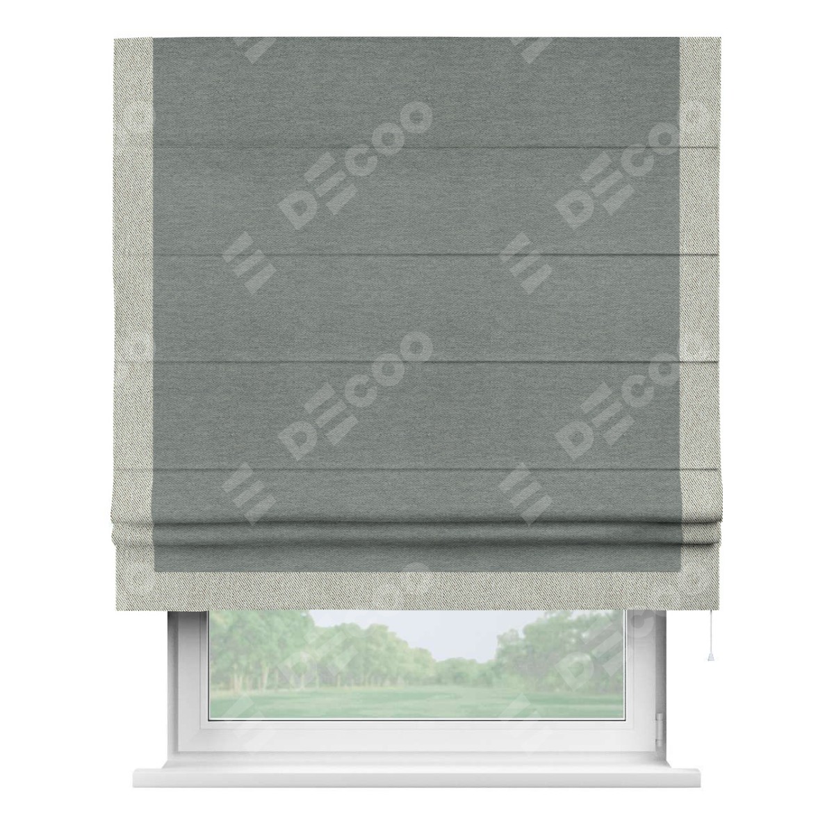 Римская штора производителя «Cortin», используется для проёма, пошита из ткани твид блэкаут серый, артикул 21577. Отделка шторы кантом «Виктория», ткань для канта используется из твида разной расцветки на выбор. Имеет универсальный механизм и подходит для монтажа: на потолок, на стену и в нишу.