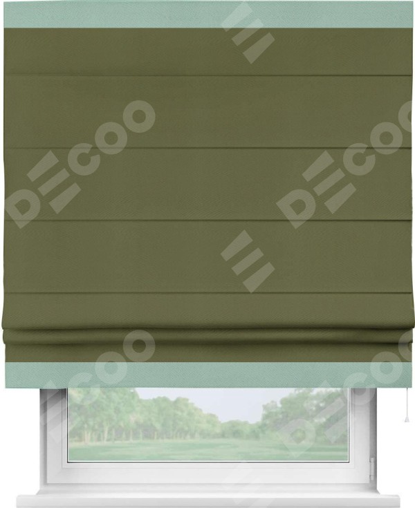 Римская штора производителя «Cortin», используется для проёма, пошита из ткани блэкаут однотонный зелёный, артикул ткани 81859. Отделка шторы кантом «Горизонт», ткань для канта используется из блэкаута однотонного разной расцветки на выбор. Имеет универсальный механизм и подходит для монтажа: на потолок, на стену и в нишу.