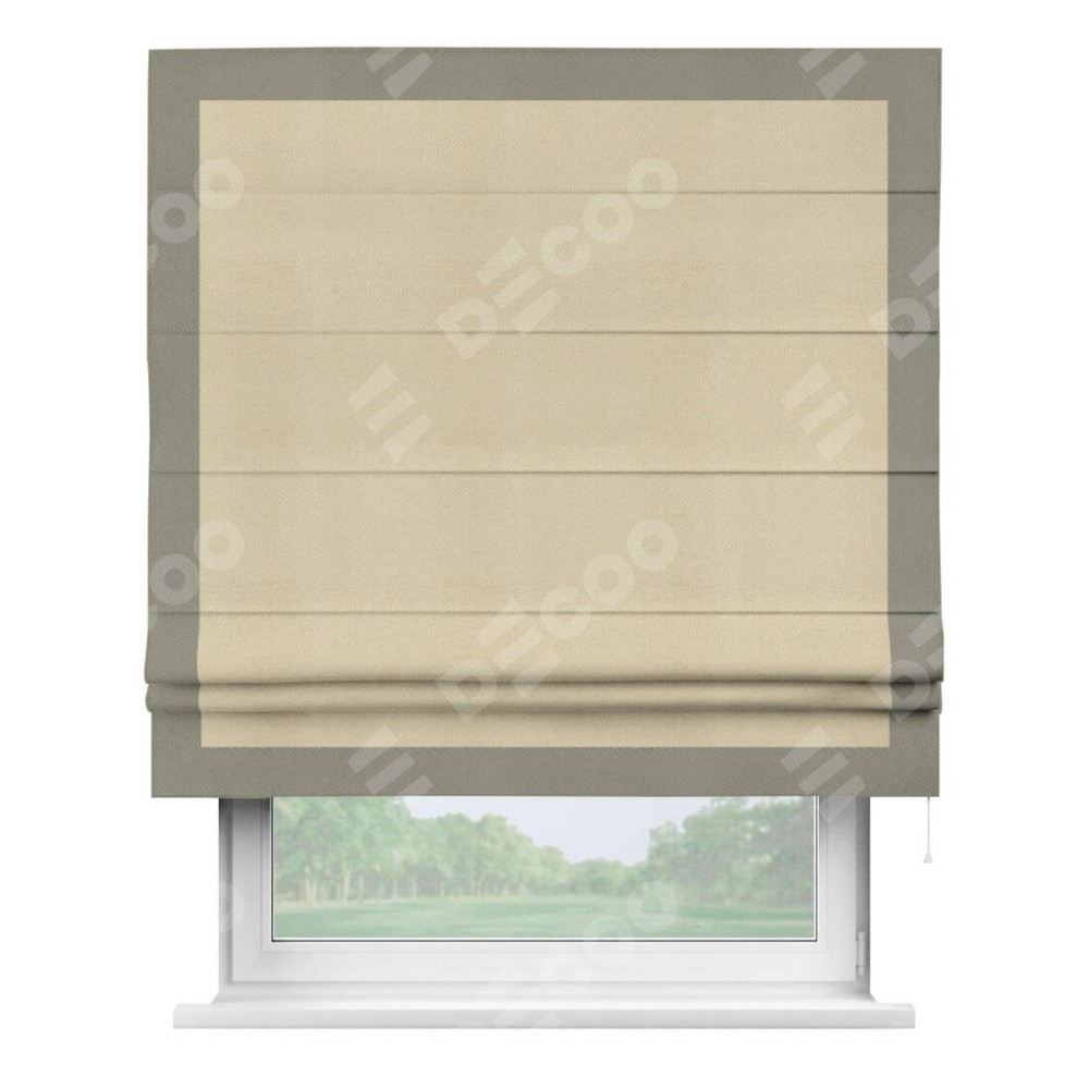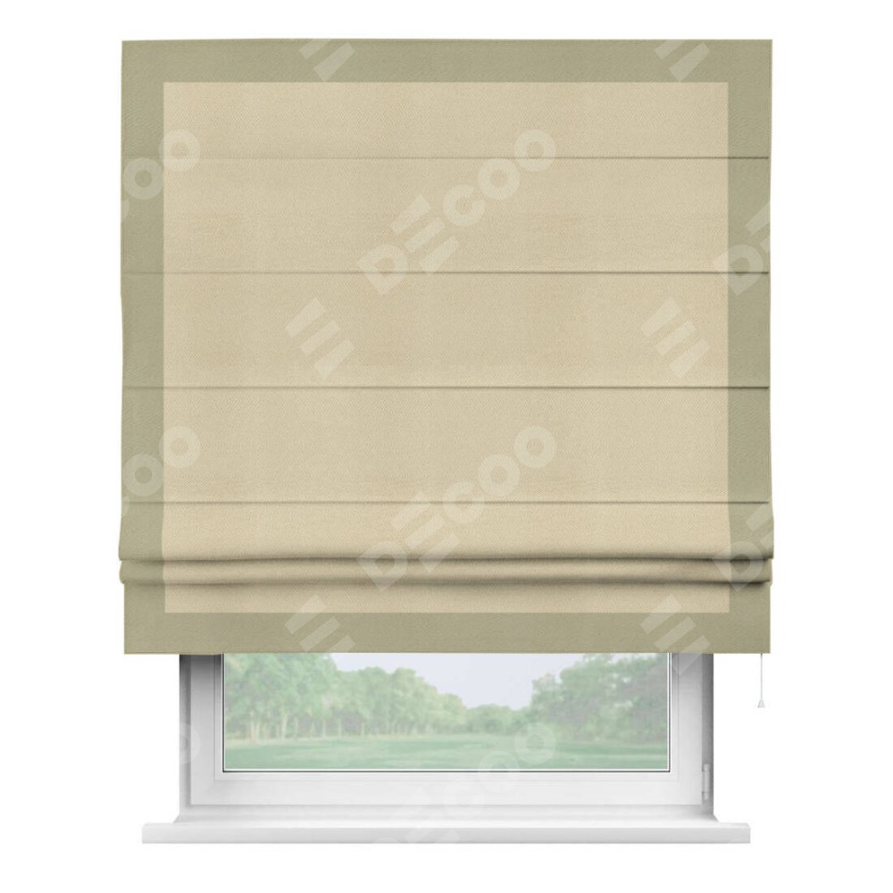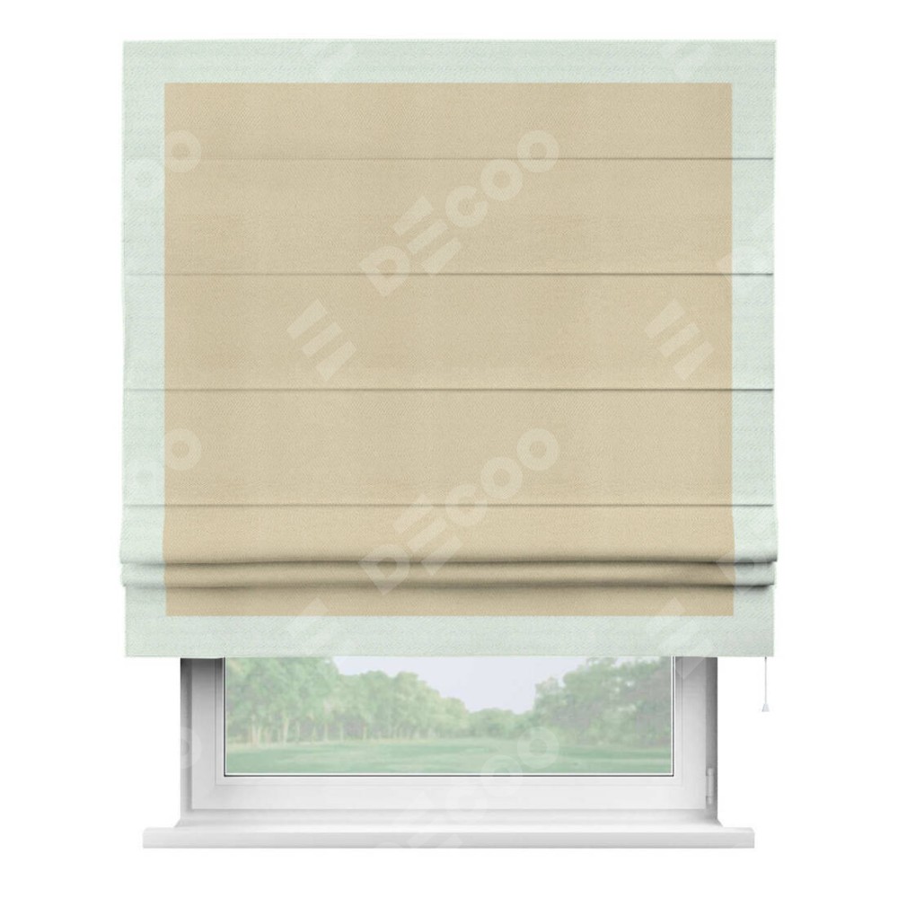 Римская штора производителя «Cortin», используется для проёма, пошита из ткани блэкаут однотонный милано латте, артикул ткани 05. Отделка шторы кантом «Чесс», ткань для канта используется из блэкаута однотонного разной расцветки на выбор. Имеет универсальный механизм и подходит для монтажа: на потолок, на стену и в нишу.