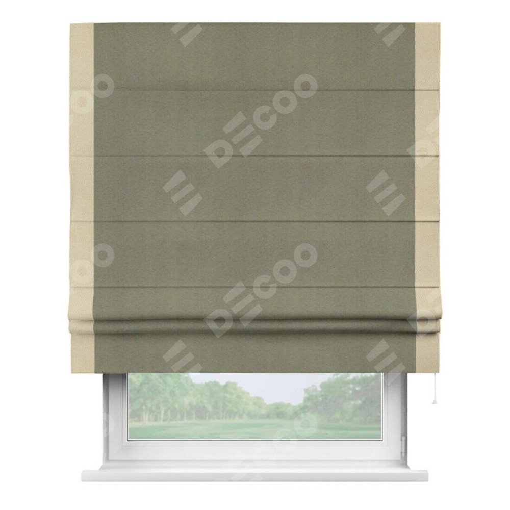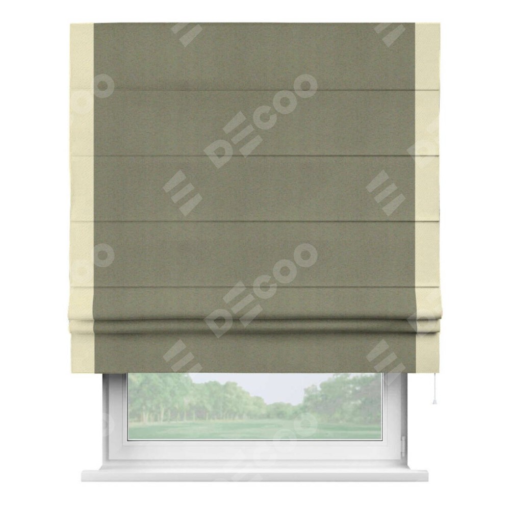 Римская штора производителя «Cortin», используется для проёма, пошита из ткани блэкаут однотонный серо-коричневый, артикул ткани 29568. Отделка шторы кантом «Стрим Дуо», ткань для канта используется из блэкаута однотонного разной расцветки на выбор. Имеет универсальный механизм и подходит для монтажа: на потолок, на стену и в нишу.