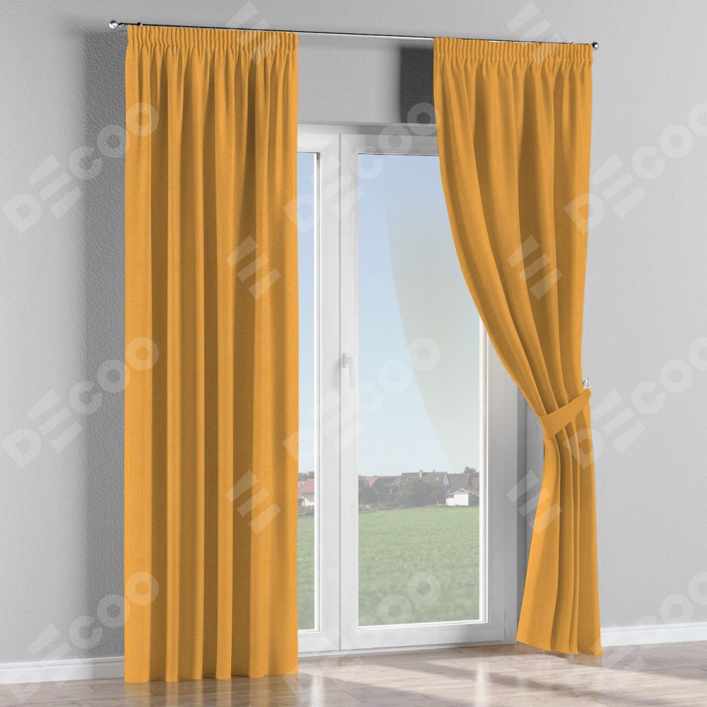 Комплект прямых штор, от производителя «Cortin», пошиты из ткани блэкаут с блеском золотой, артикул ткани 34626. С изнаночной стороны в верхней части штор пристрачивается шторная лента с декоративными складками «Карандаш». Обратная сторона основного материала черного цвета, что обеспечивает необходимую светонепроницаемость. Для создания элегантных складок прямые шторы шьются по стандарту с коэффициентом 1:2 (на 100 см. ширины проёма 200 см. ширины ткани).