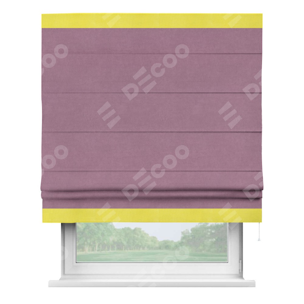 Римская штора производителя «Cortin», используется для проёма, пошита из ткани вельвет лиловый, артикул ткани 17752. Отделка шторы кантом «Горизонт», ткань для канта используется из вельвета разной расцветки на выбор. Имеет универсальный механизм и подходит для монтажа: на потолок, на стену и в нишу.