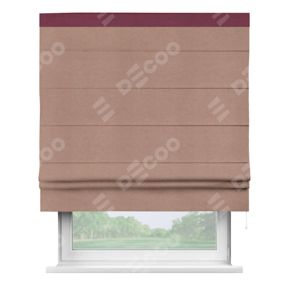 Римская штора производителя «Cortin», используется для проёма, пошита из ткани вельвет брусничный джем, артикул ткани 17750. Отделка шторы кантом «Кинг», ткань для канта используется из вельвета разной расцветки на выбор. Имеет универсальный механизм и подходит для монтажа: на потолок, на стену и в нишу.