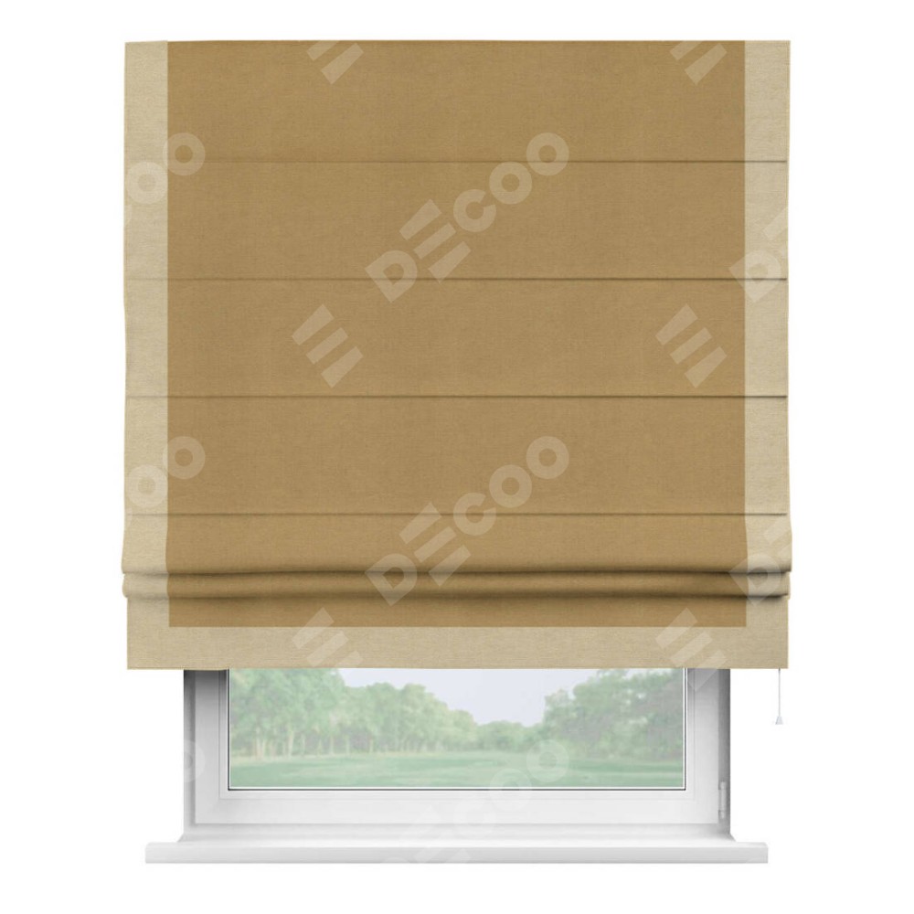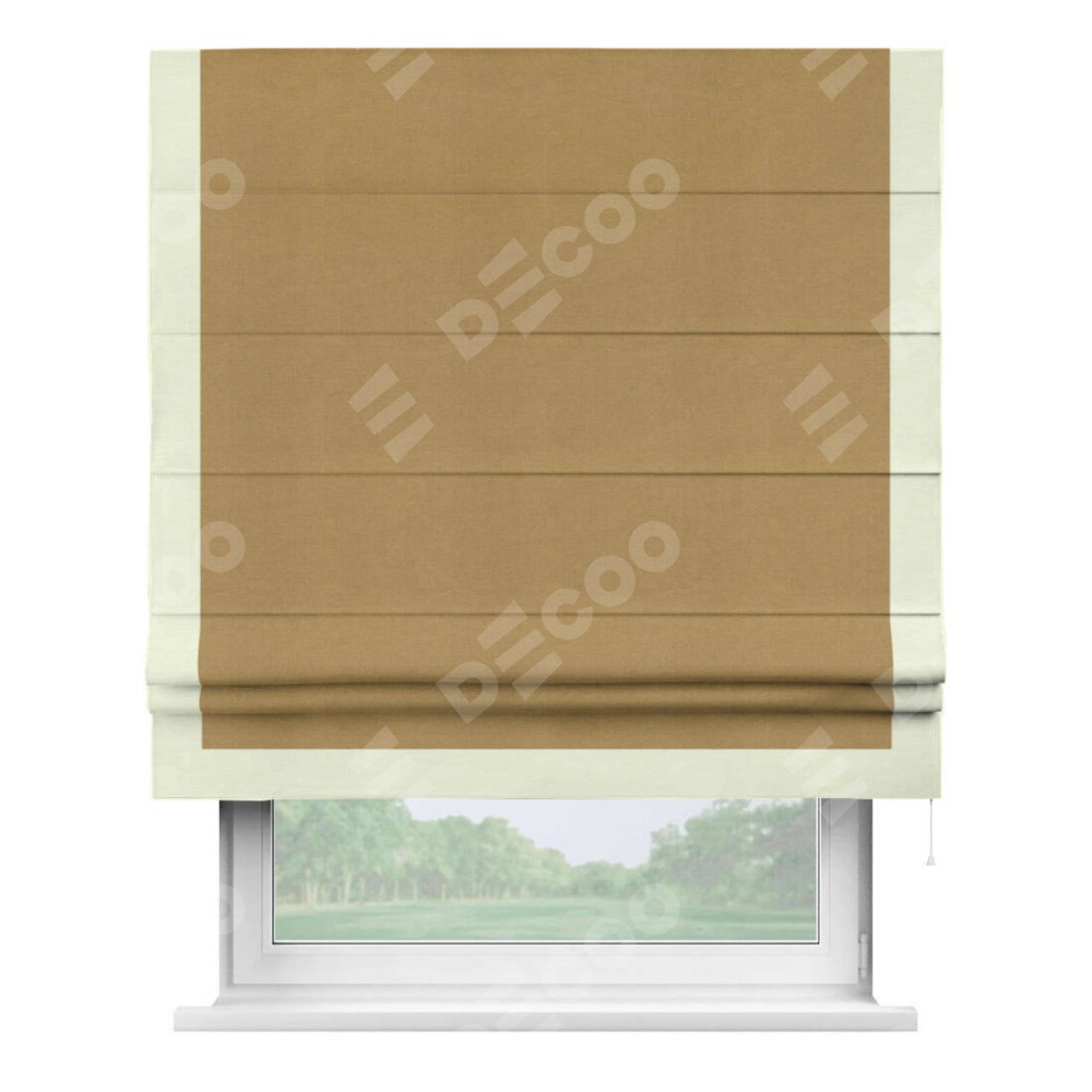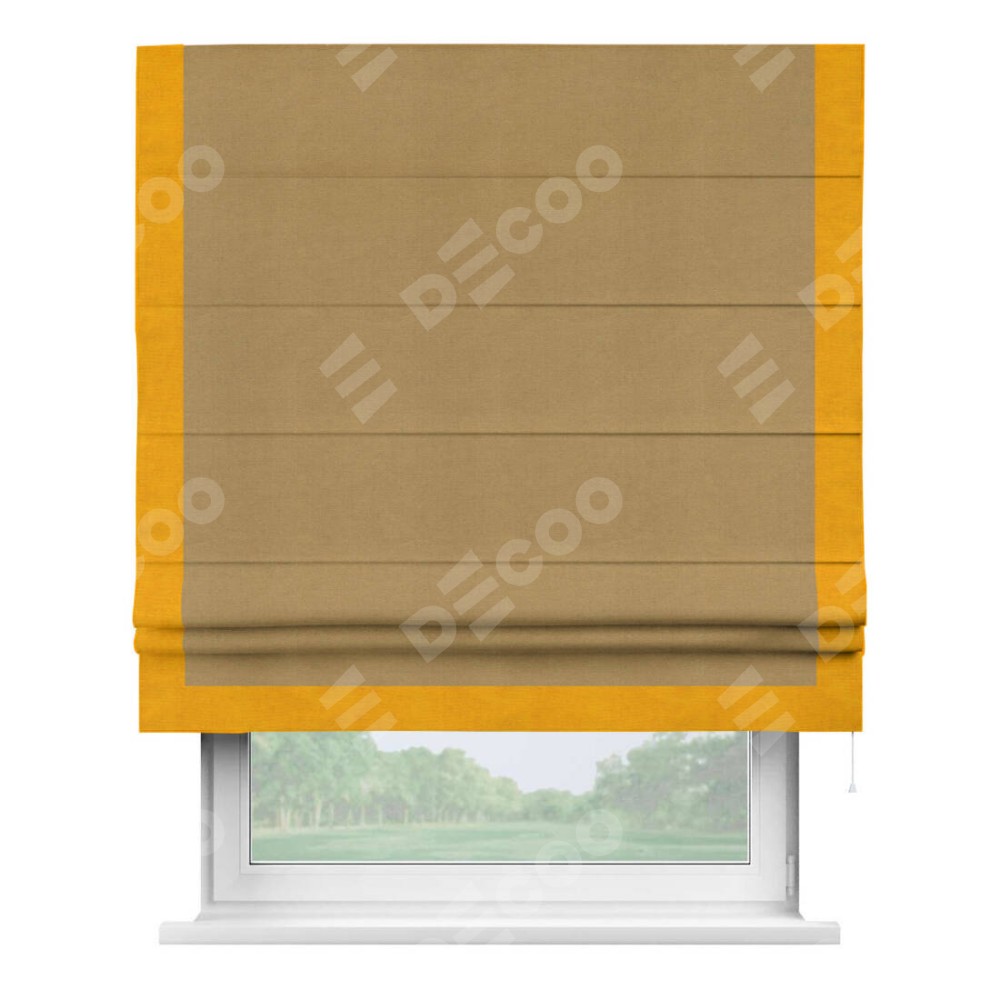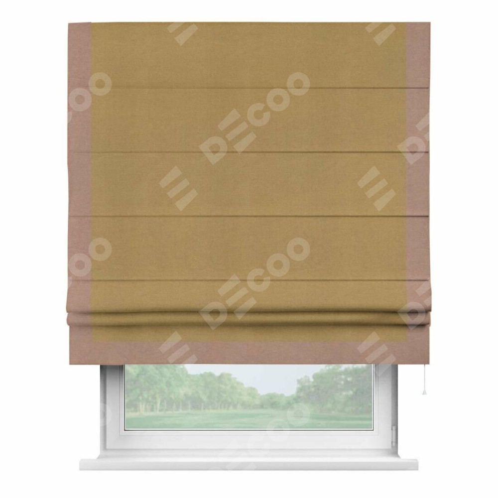 Римская штора производителя «Cortin», используется для проёма, пошита из ткани вельвет горчица, артикул ткани 17760. Отделка шторы кантом «Виктория», ткань для канта используется из вельвета разной расцветки на выбор. Имеет универсальный механизм и подходит для монтажа: на потолок, на стену и в нишу.