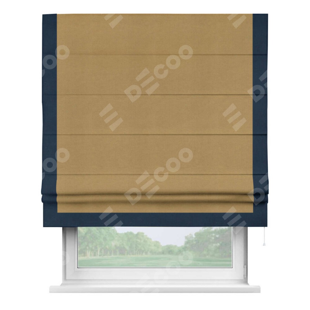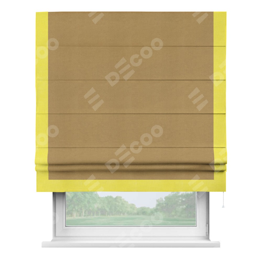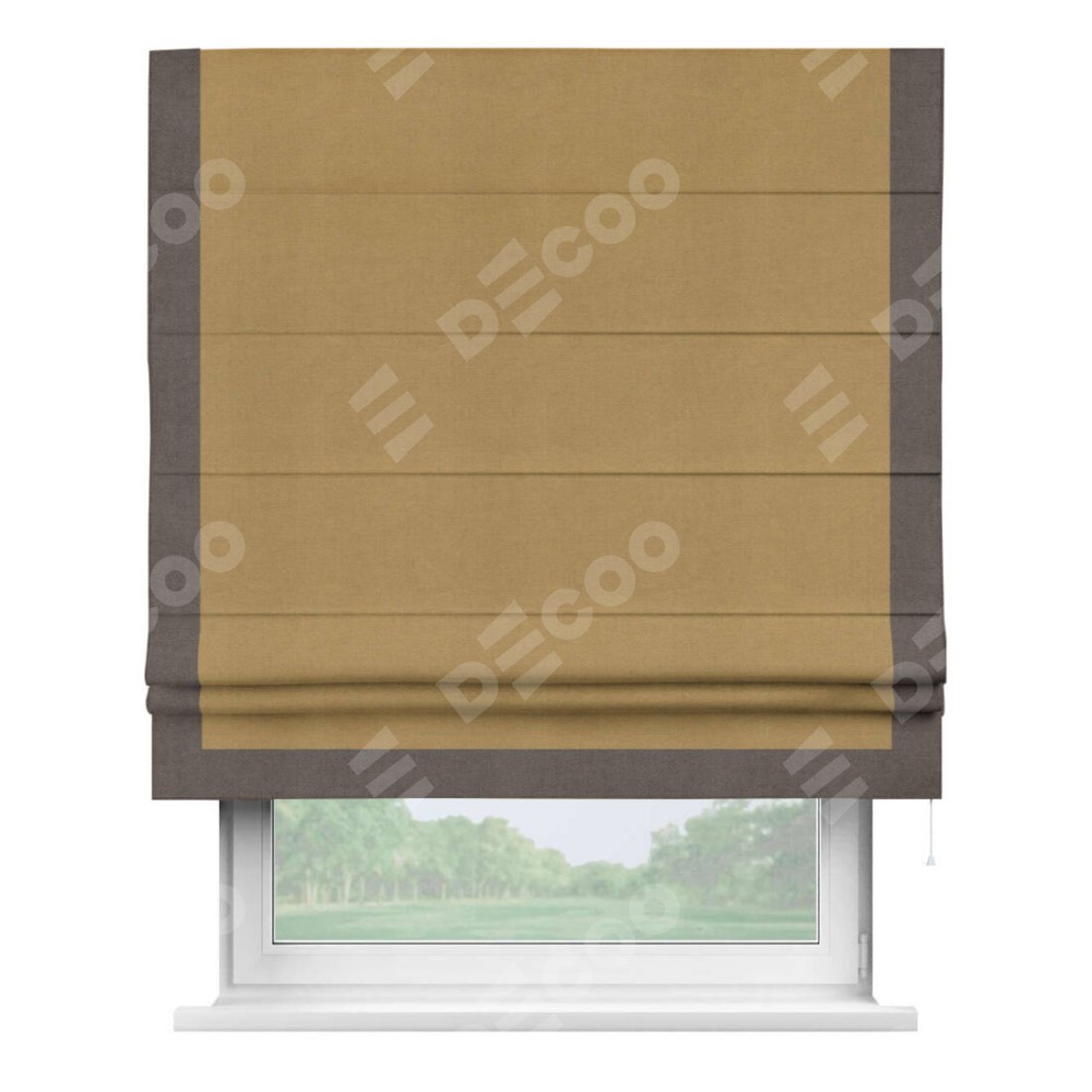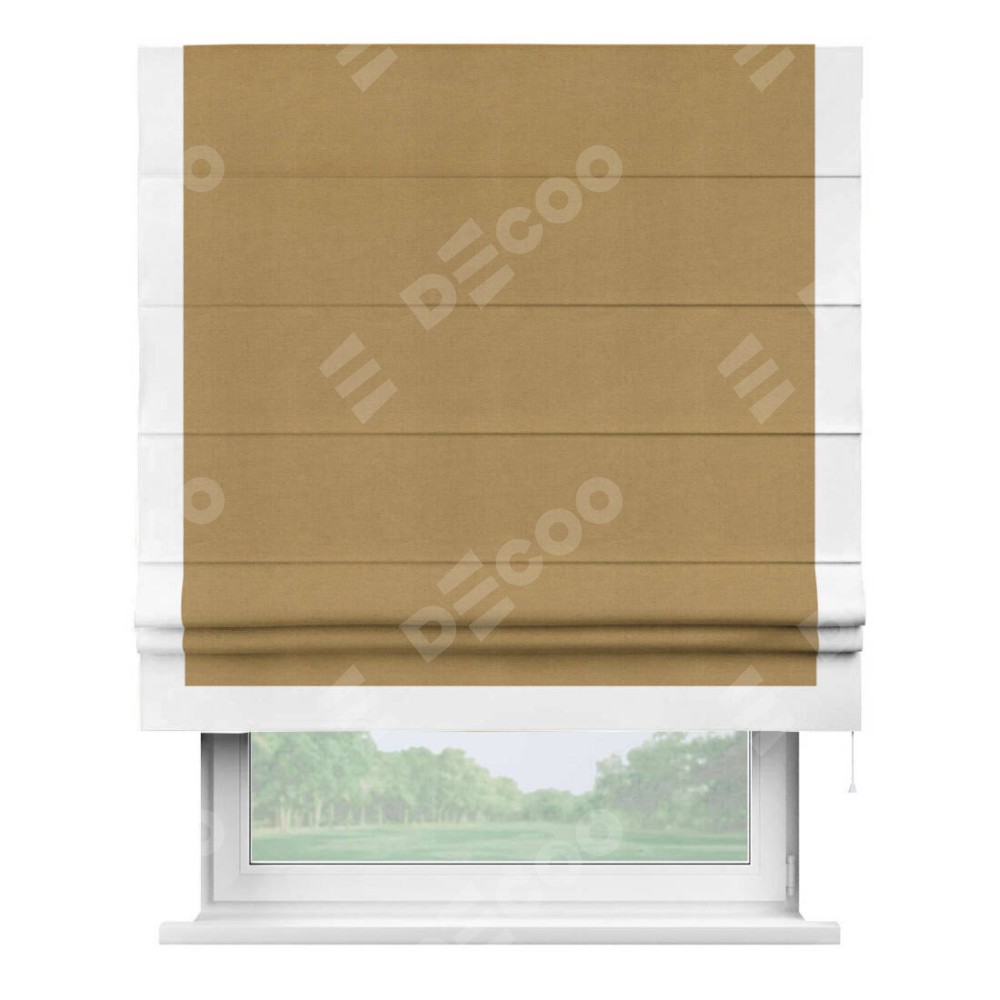Римская штора производителя «Cortin», используется для проёма, пошита из ткани вельвет горчица, артикул ткани 17760. Отделка шторы кантом «Виктория», ткань для канта используется из вельвета разной расцветки на выбор. Имеет универсальный механизм и подходит для монтажа: на потолок, на стену и в нишу.
