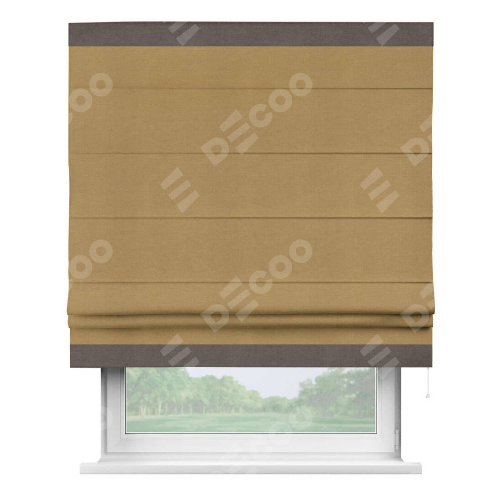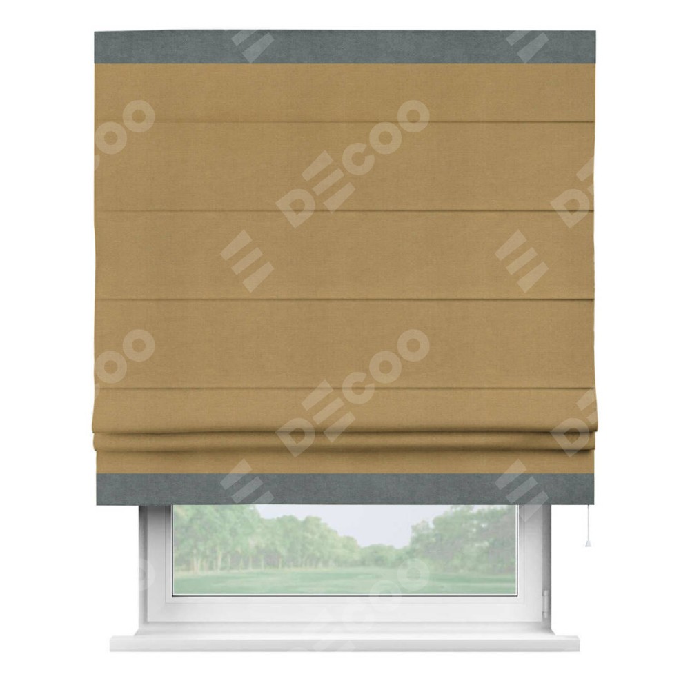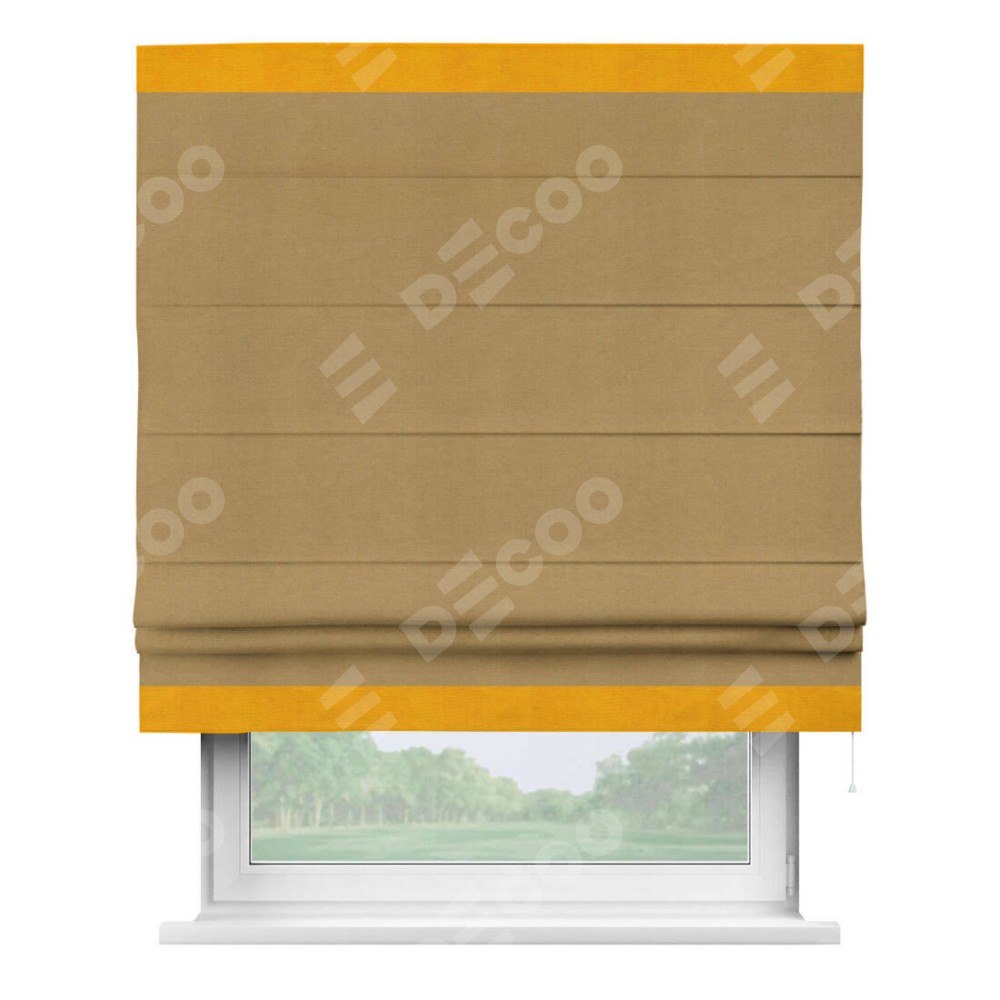 Римская штора производителя «Cortin», используется для проёма, пошита из ткани вельвет горчица, артикул ткани 17760. Отделка шторы кантом «Горизонт», ткань для канта используется из вельвета разной расцветки на выбор. Имеет универсальный механизм и подходит для монтажа: на потолок, на стену и в нишу.