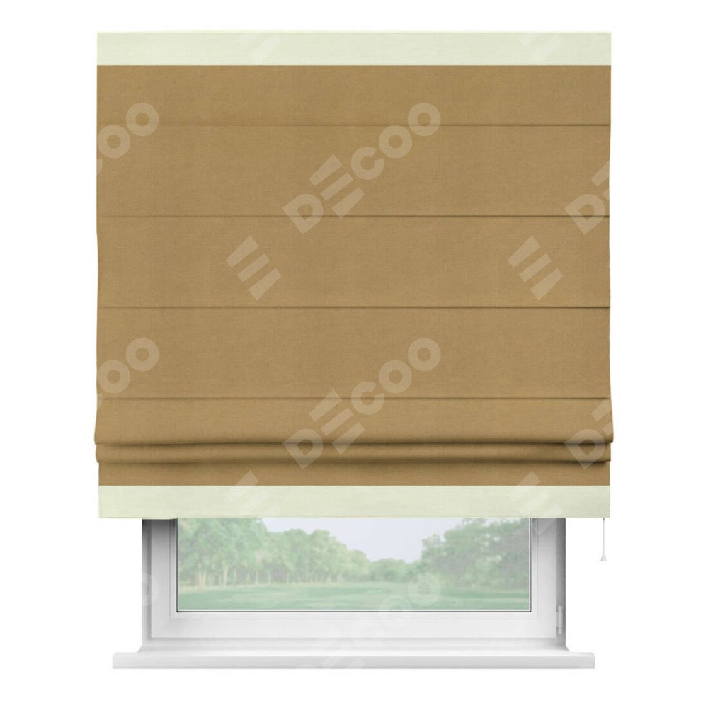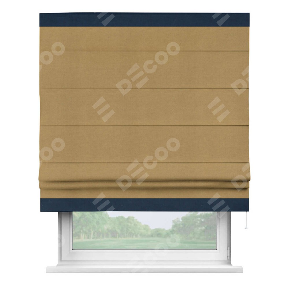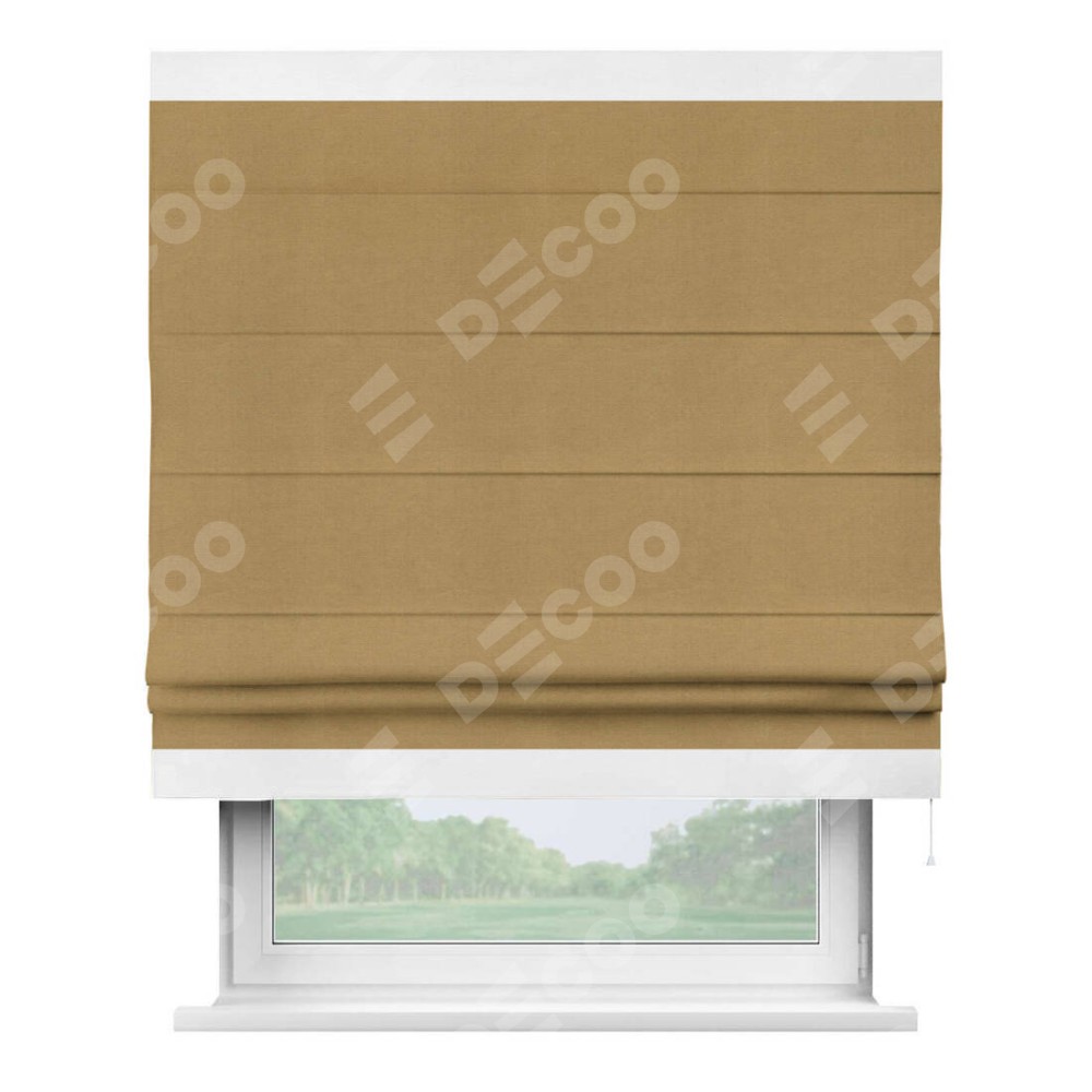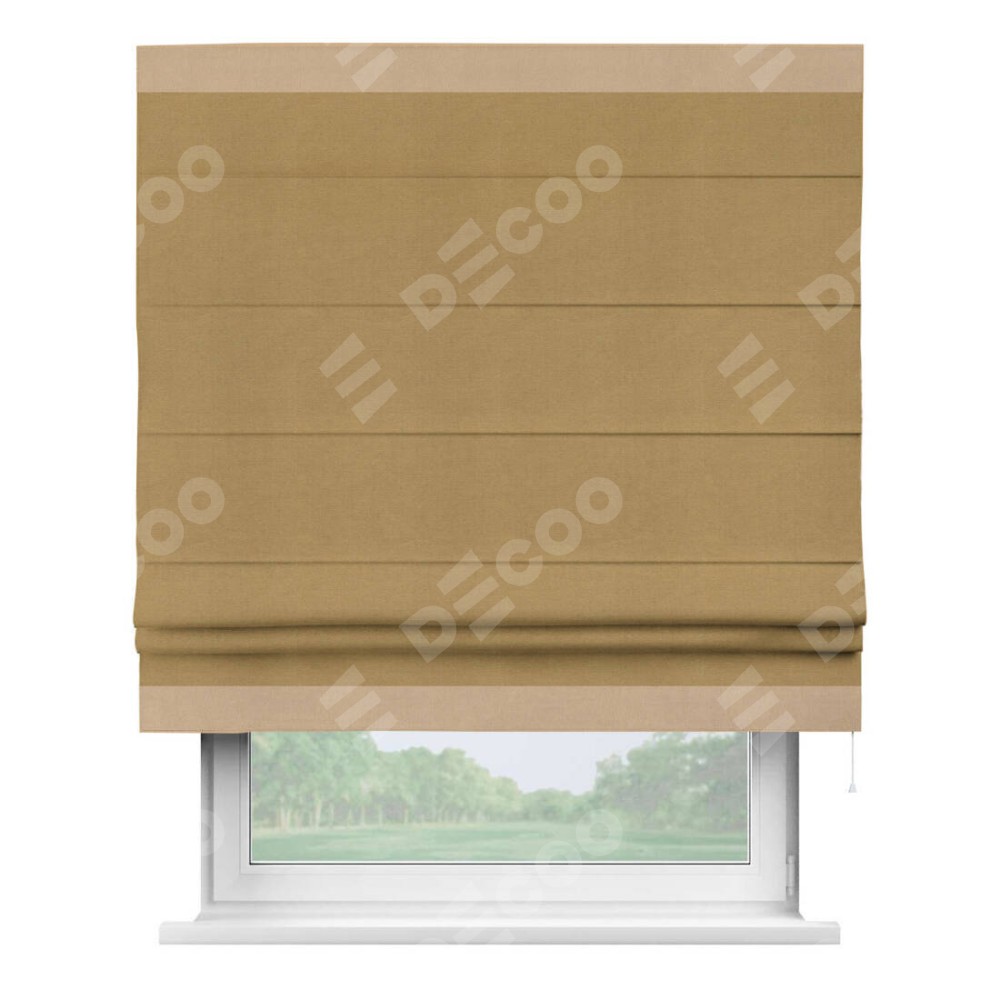 Римская штора производителя «Cortin», используется для проёма, пошита из ткани вельвет горчица, артикул ткани 17760. Отделка шторы кантом «Горизонт», ткань для канта используется из вельвета разной расцветки на выбор. Имеет универсальный механизм и подходит для монтажа: на потолок, на стену и в нишу.