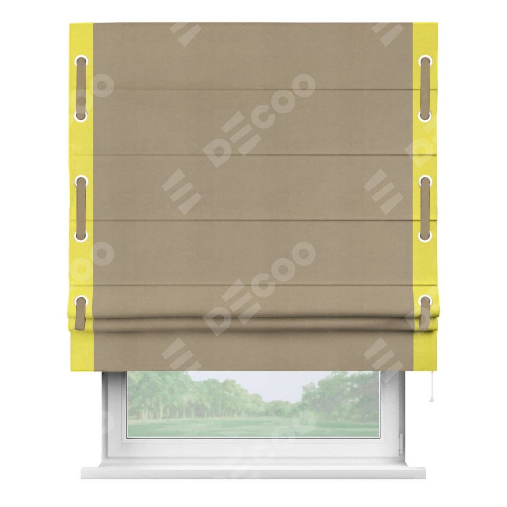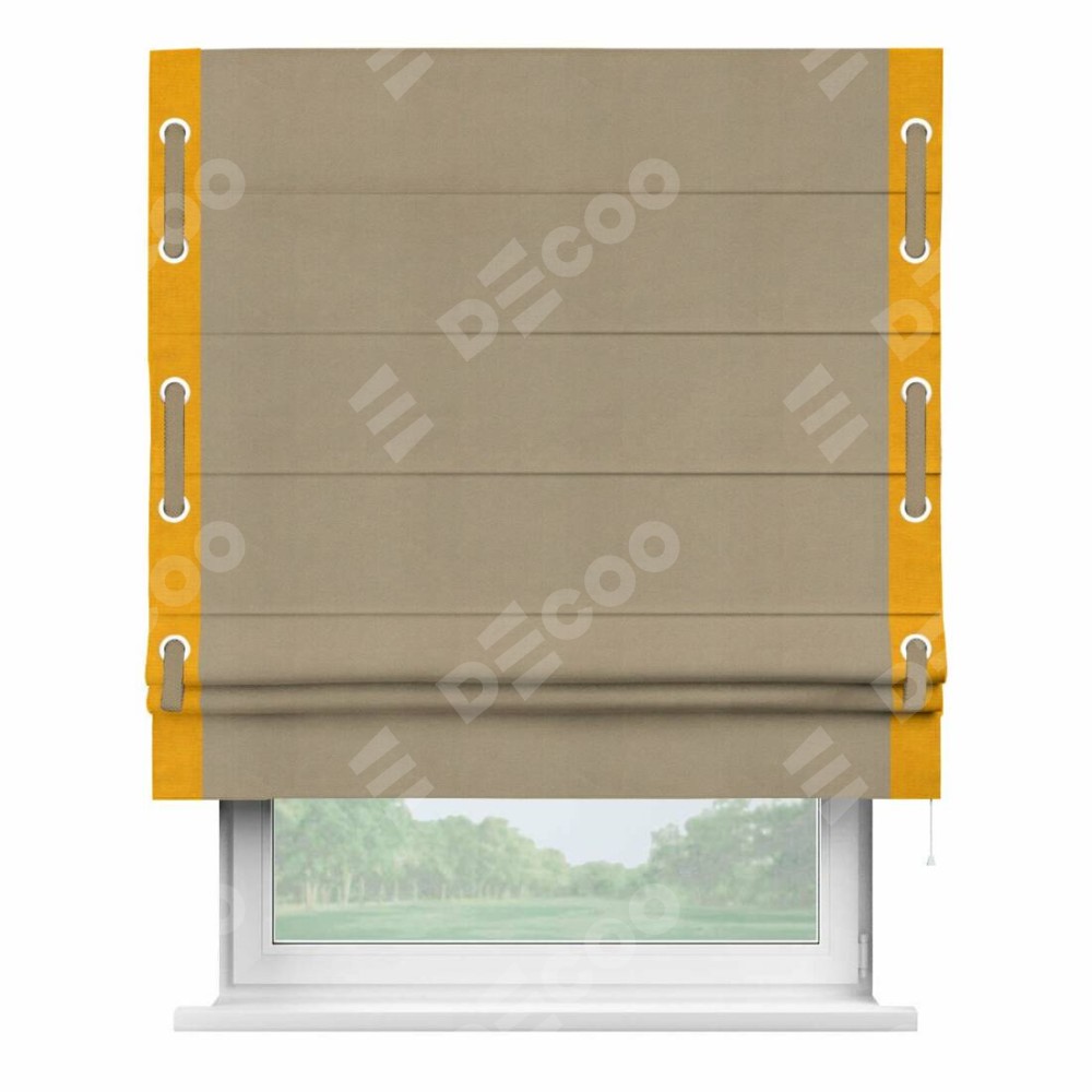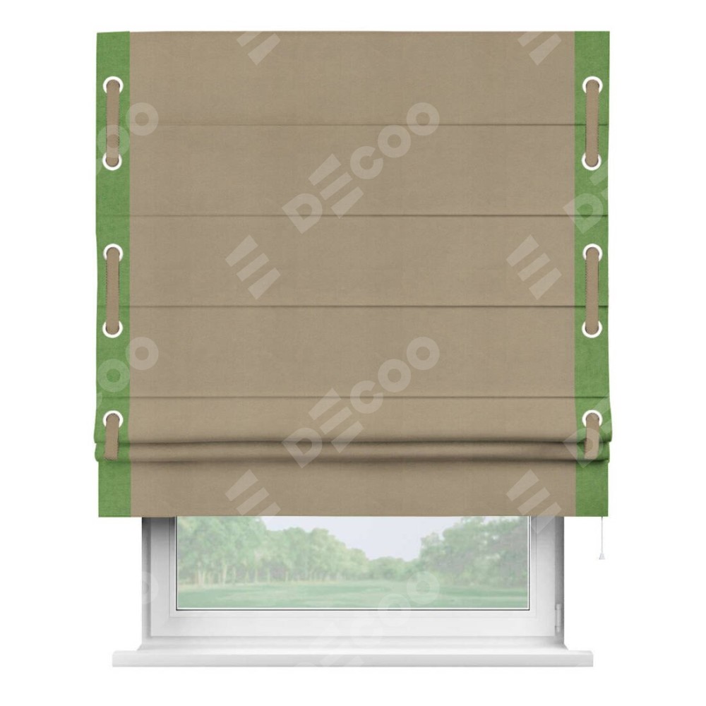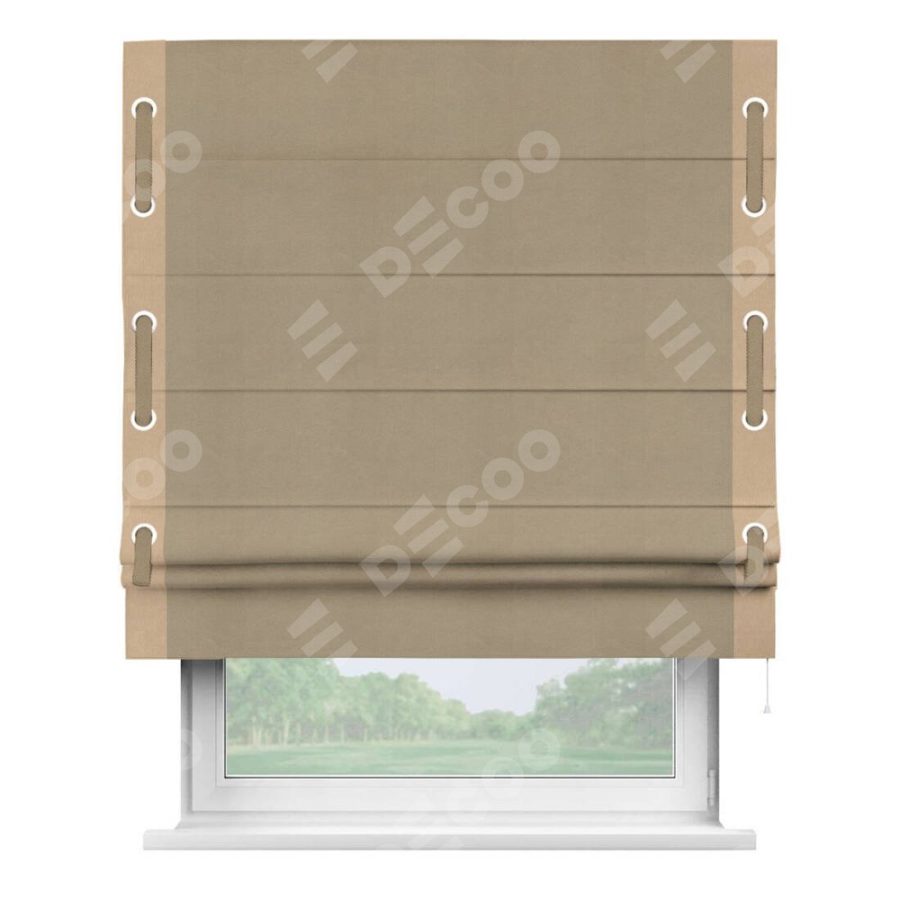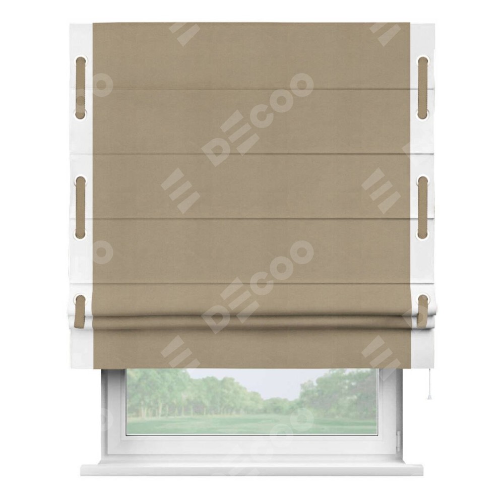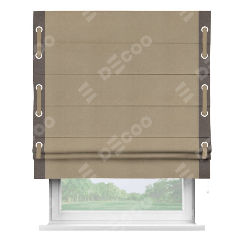 Римская штора производителя «Cortin», используется для проёма, пошита из ткани вельвет кофейный, артикул ткани 30980. Отделка шторы кантом «Стрим Дуо» на кантах расположены люверсы с пояском, ткань для канта используется из вельвета разной расцветки на выбор. Ткань для пояска обычно используется из основной ткани шторы, а так же можно сделать из любой расцветки по желанию. Имеет универсальный механизм и подходит для монтажа: на потолок, на стену и в нишу.