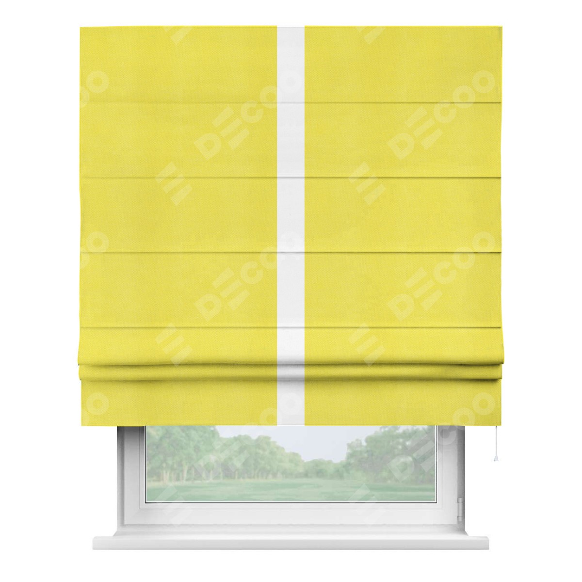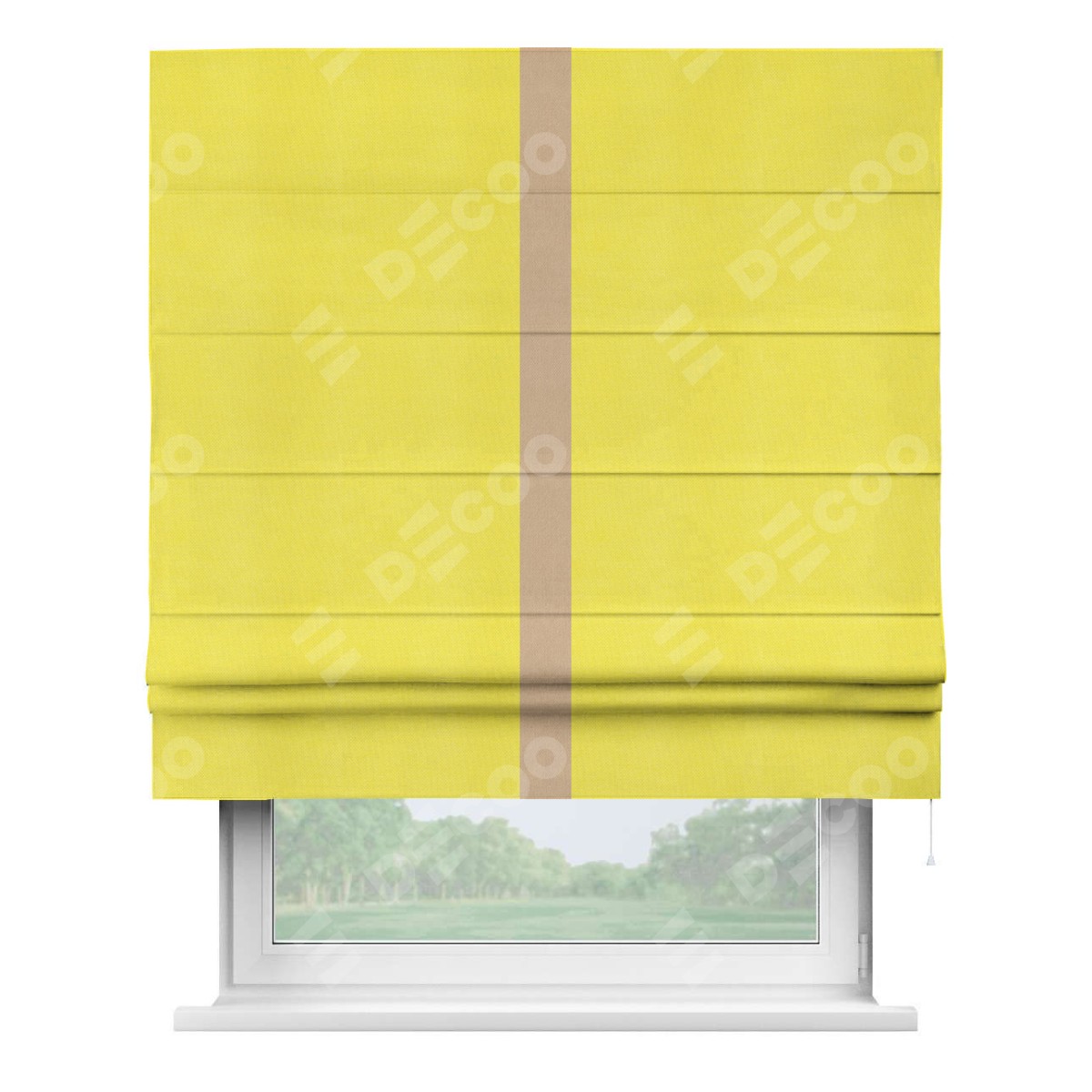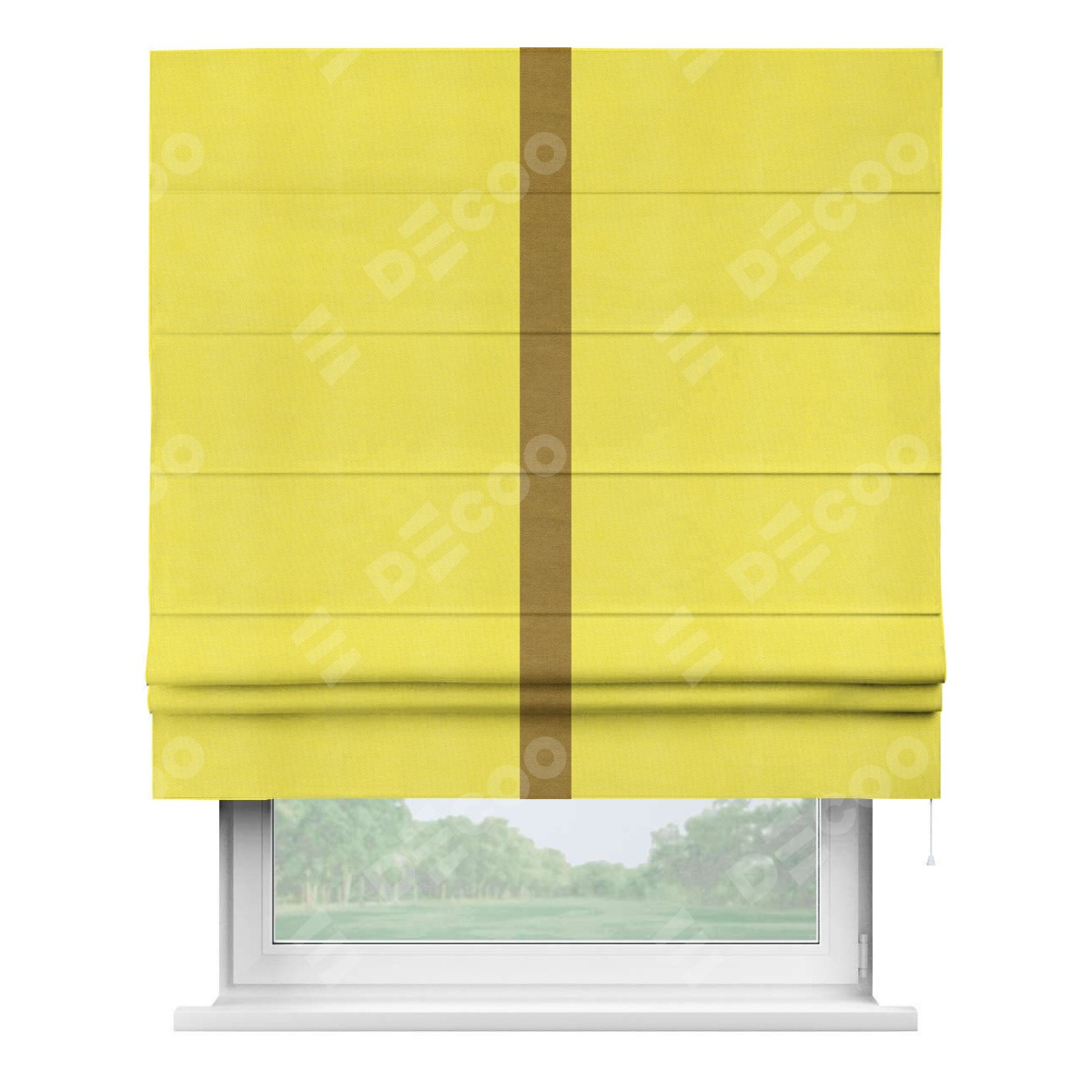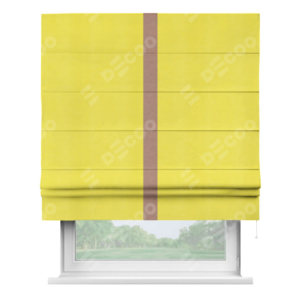Римская штора производителя «Cortin», используется для проёма, пошита из ткани вельвет cветло-желтый, артикул ткани 30997. Отделка шторы кантом «Хайвей», ткань для канта используется из вельвета разной расцветки на выбор. Имеет универсальный механизм и подходит для монтажа: на потолок, на стену и в нишу.