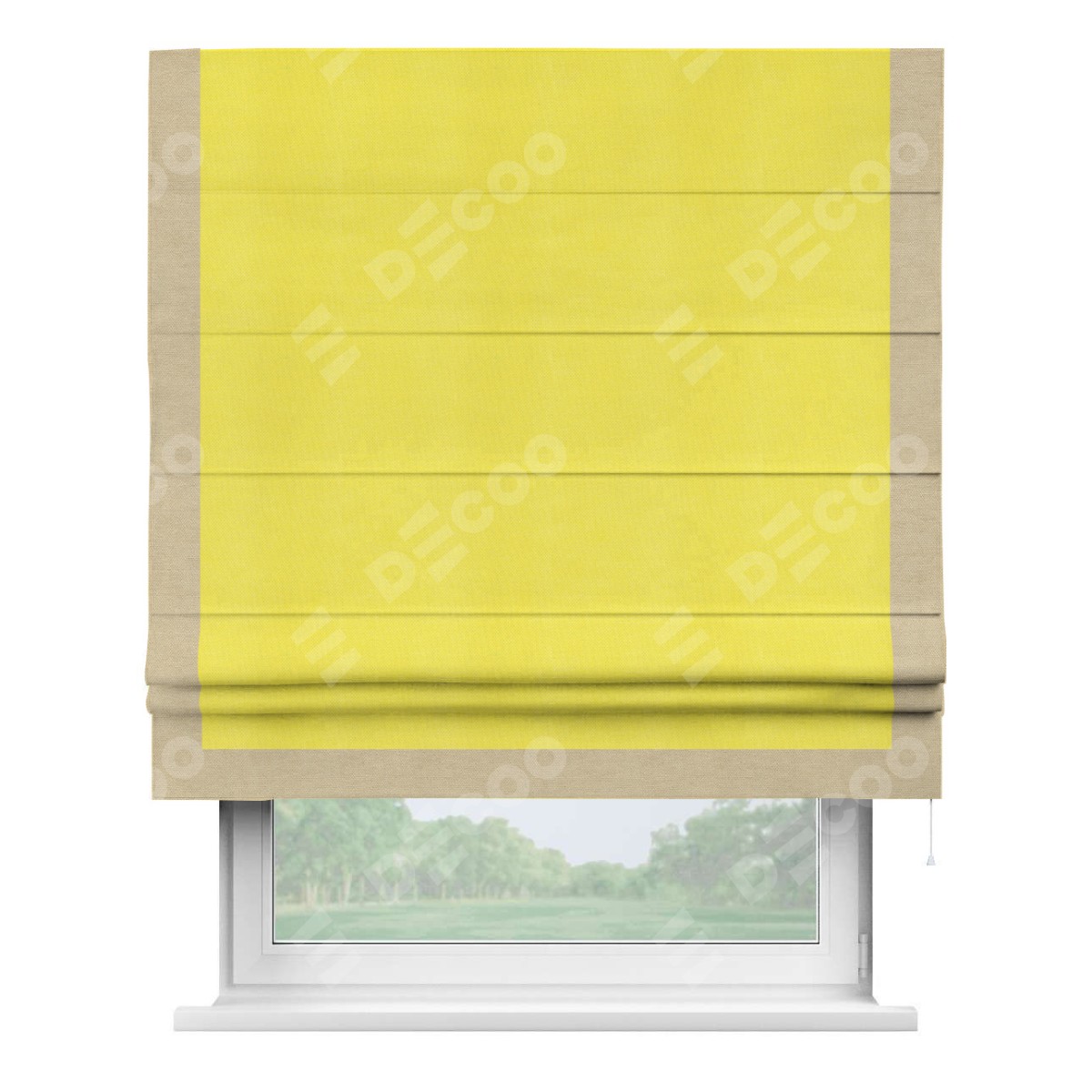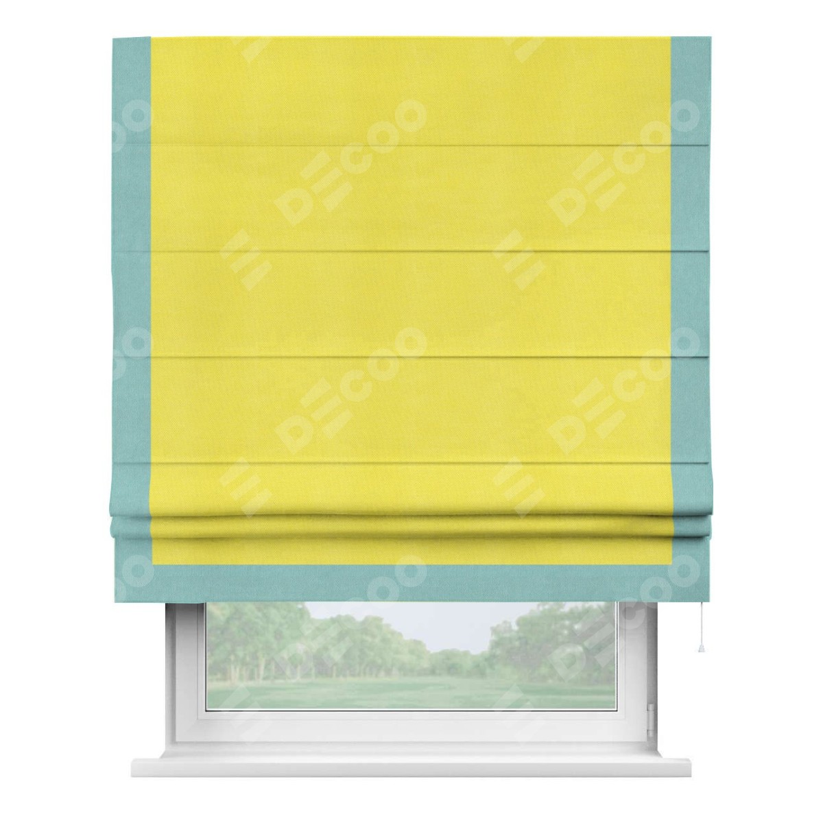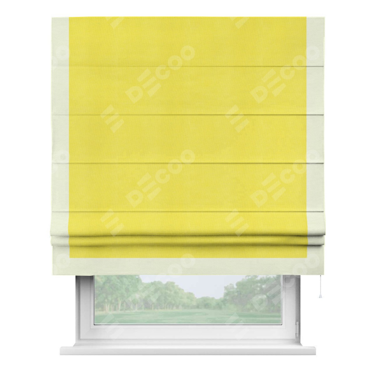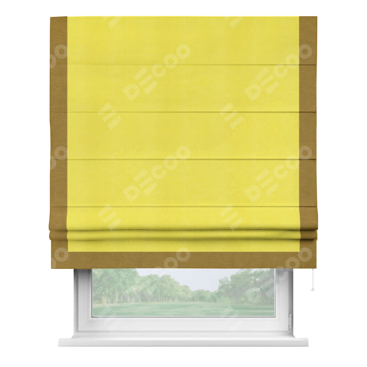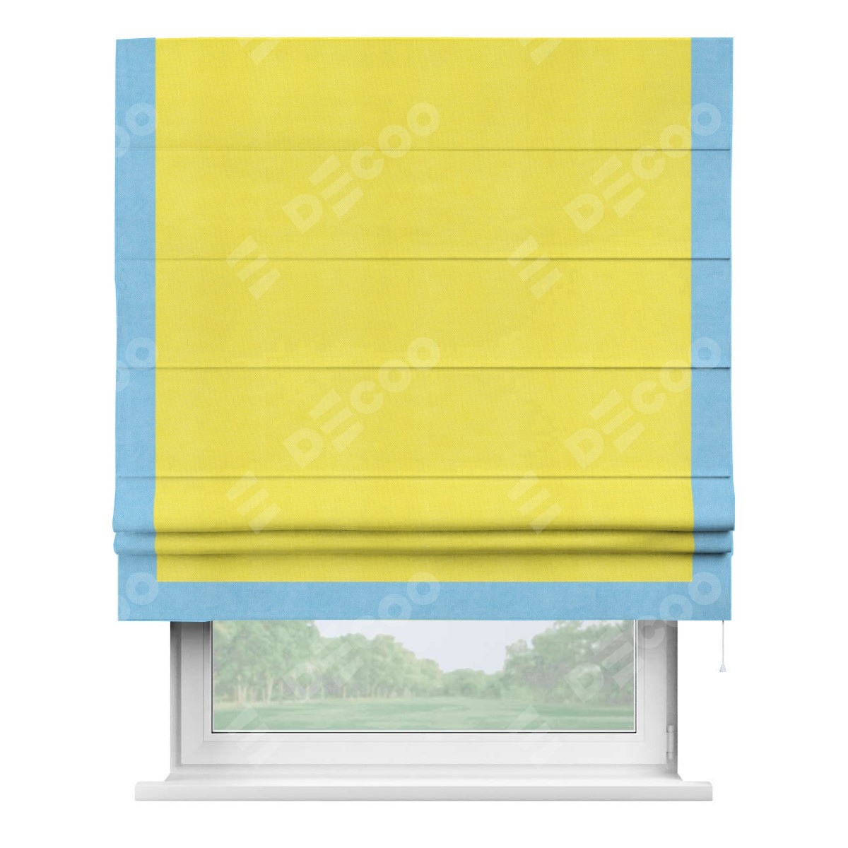 Римская штора производителя «Cortin», используется для проёма, пошита из ткани вельвет cветло-желтый, артикул ткани 30997. Отделка шторы кантом «Виктория», ткань для канта используется из вельвета разной расцветки на выбор. Имеет универсальный механизм и подходит для монтажа: на потолок, на стену и в нишу.