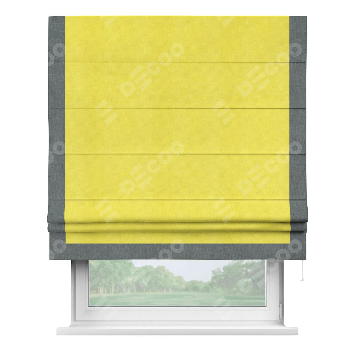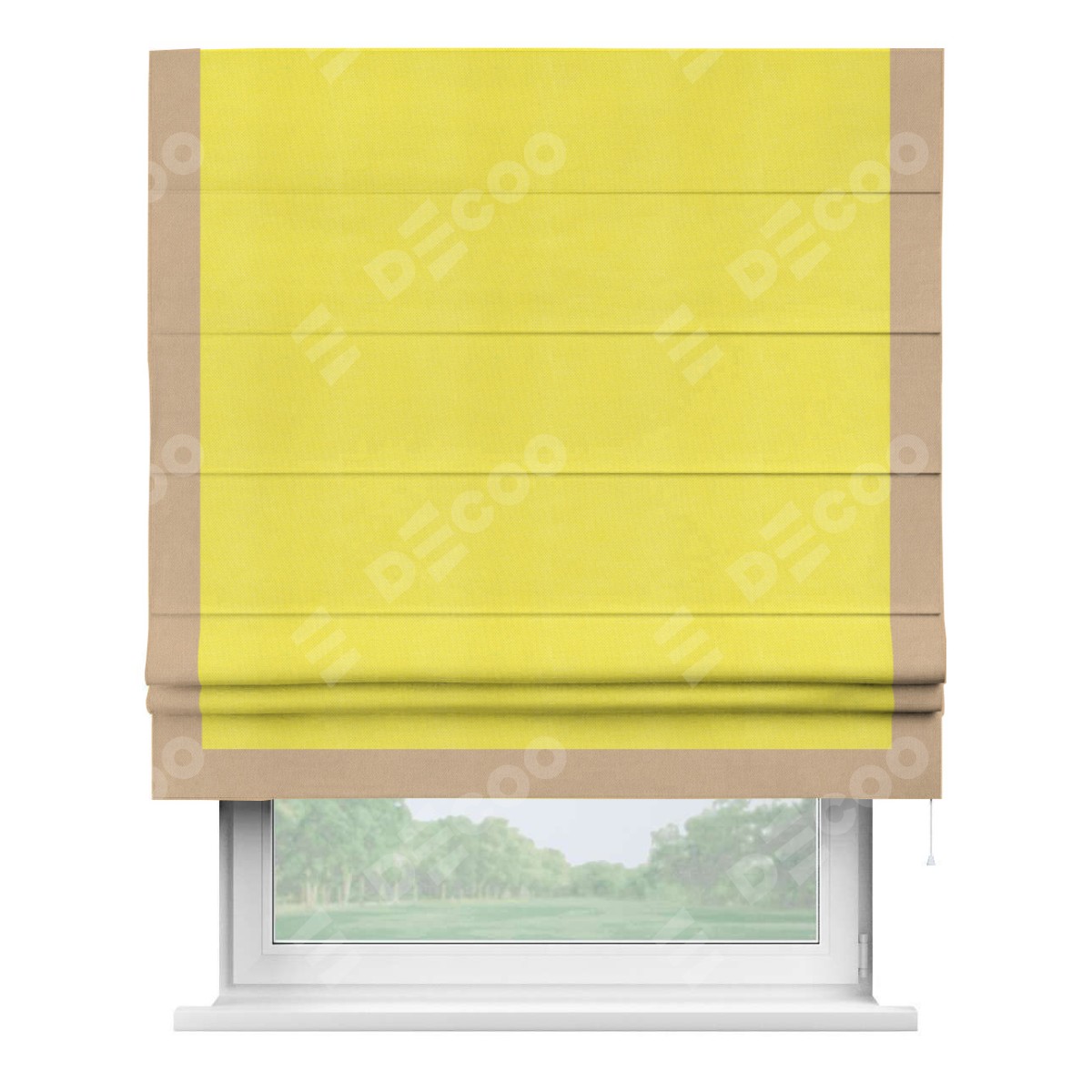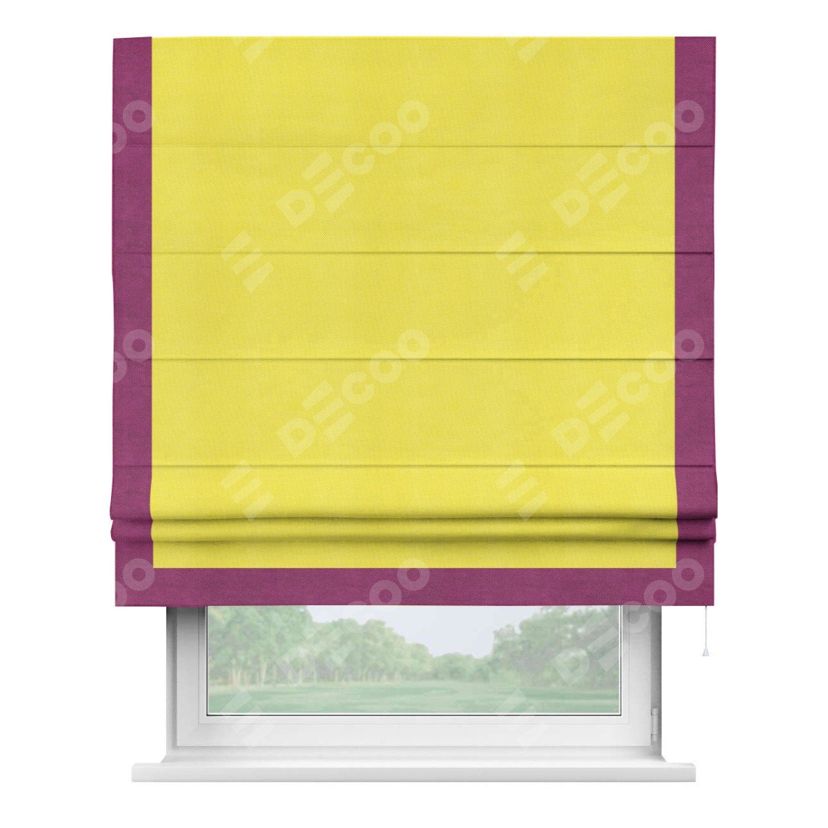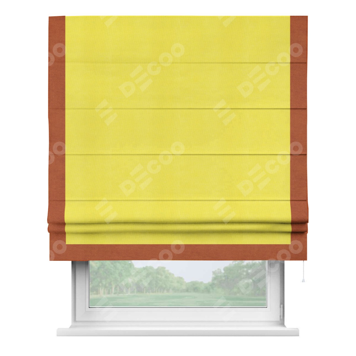 Римская штора производителя «Cortin», используется для проёма, пошита из ткани вельвет cветло-желтый, артикул ткани 30997. Отделка шторы кантом «Виктория», ткань для канта используется из вельвета разной расцветки на выбор. Имеет универсальный механизм и подходит для монтажа: на потолок, на стену и в нишу.