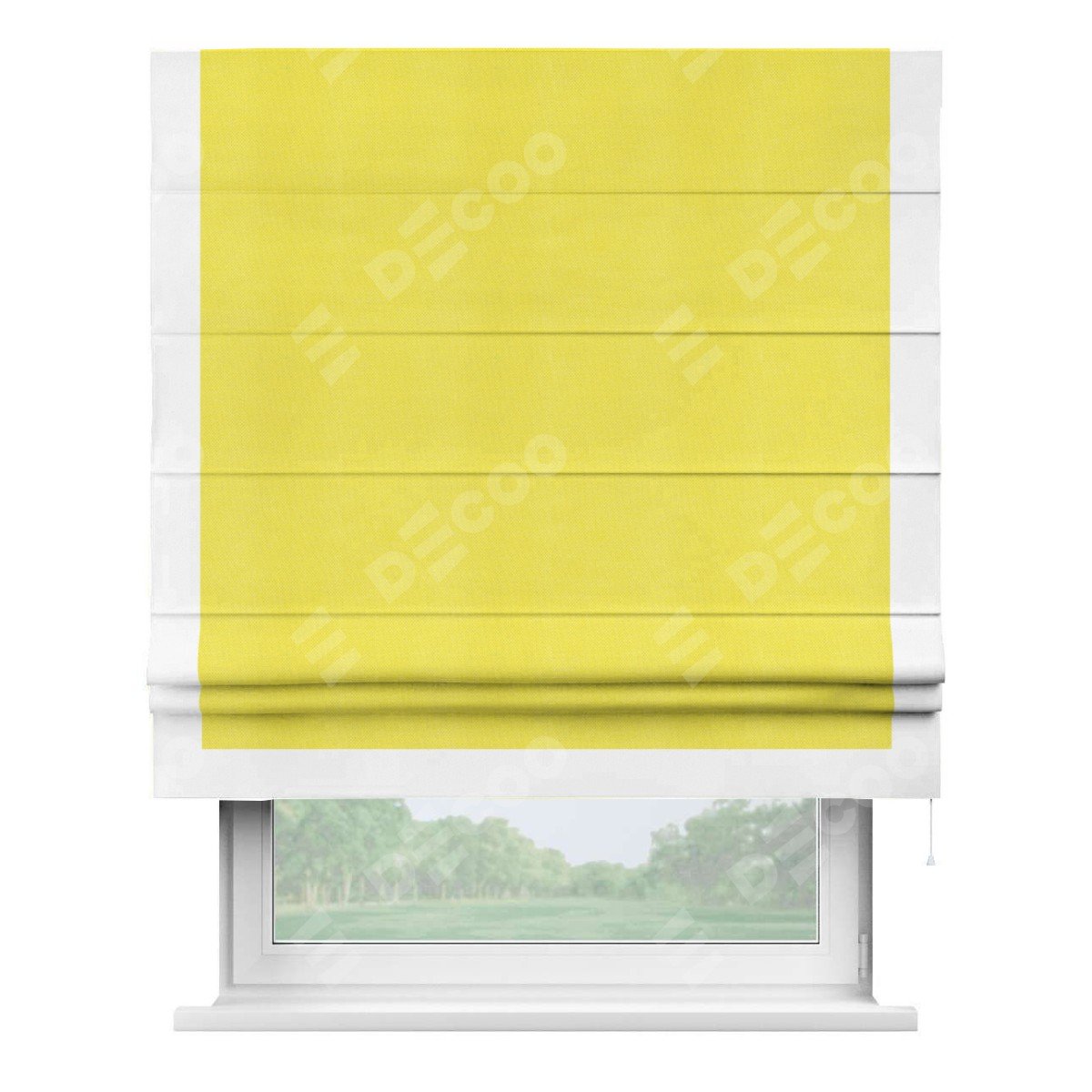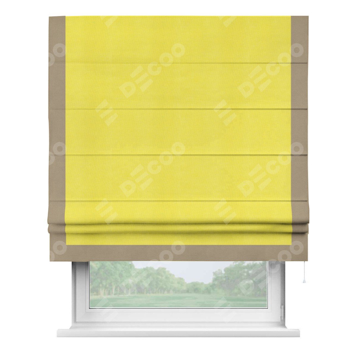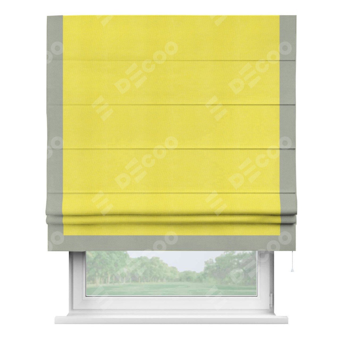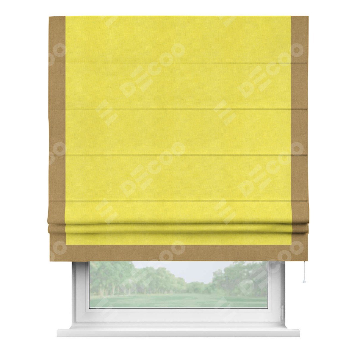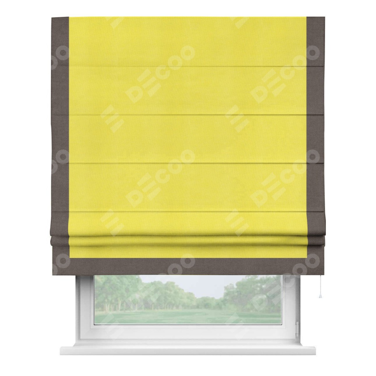 Римская штора производителя «Cortin», используется для проёма, пошита из ткани вельвет cветло-желтый, артикул ткани 30997. Отделка шторы кантом «Виктория», ткань для канта используется из вельвета разной расцветки на выбор. Имеет универсальный механизм и подходит для монтажа: на потолок, на стену и в нишу.