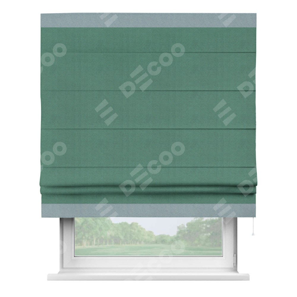 Римская штора производителя «Cortin», используется для проёма, пошита из ткани блэкаут с блеском изумрудный, артикул 34628. Отделка шторы кантом «Горизонт», ткань для канта используется из блэкаута с блеском разной расцветки на выбор. Изнаночная сторона материала черного цвета, что обеспечивает необходимую светонепроницаемость. Имеет универсальный механизм и подходит для монтажа: на потолок, на стену и в нишу.