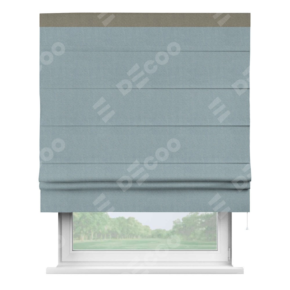 Римская штора производителя «Cortin», используется для проёма, пошита из ткани блэкаут с блеском синий, артикул 34625. Отделка шторы кантом «Кинг», ткань для канта используется из блэкаута с блеском разной расцветки на выбор. Изнаночная сторона материала черного цвета, что обеспечивает необходимую светонепроницаемость. Имеет универсальный механизм и подходит для монтажа: на потолок, на стену и в нишу.