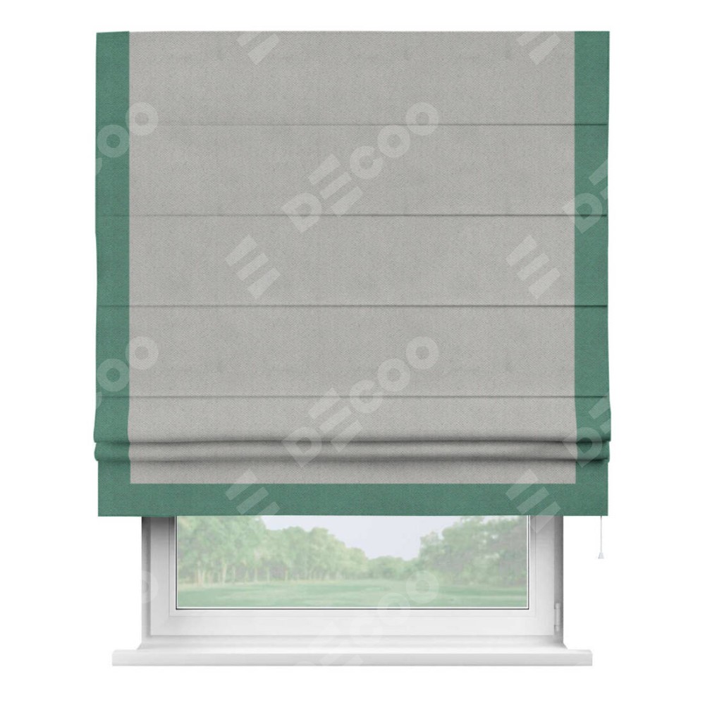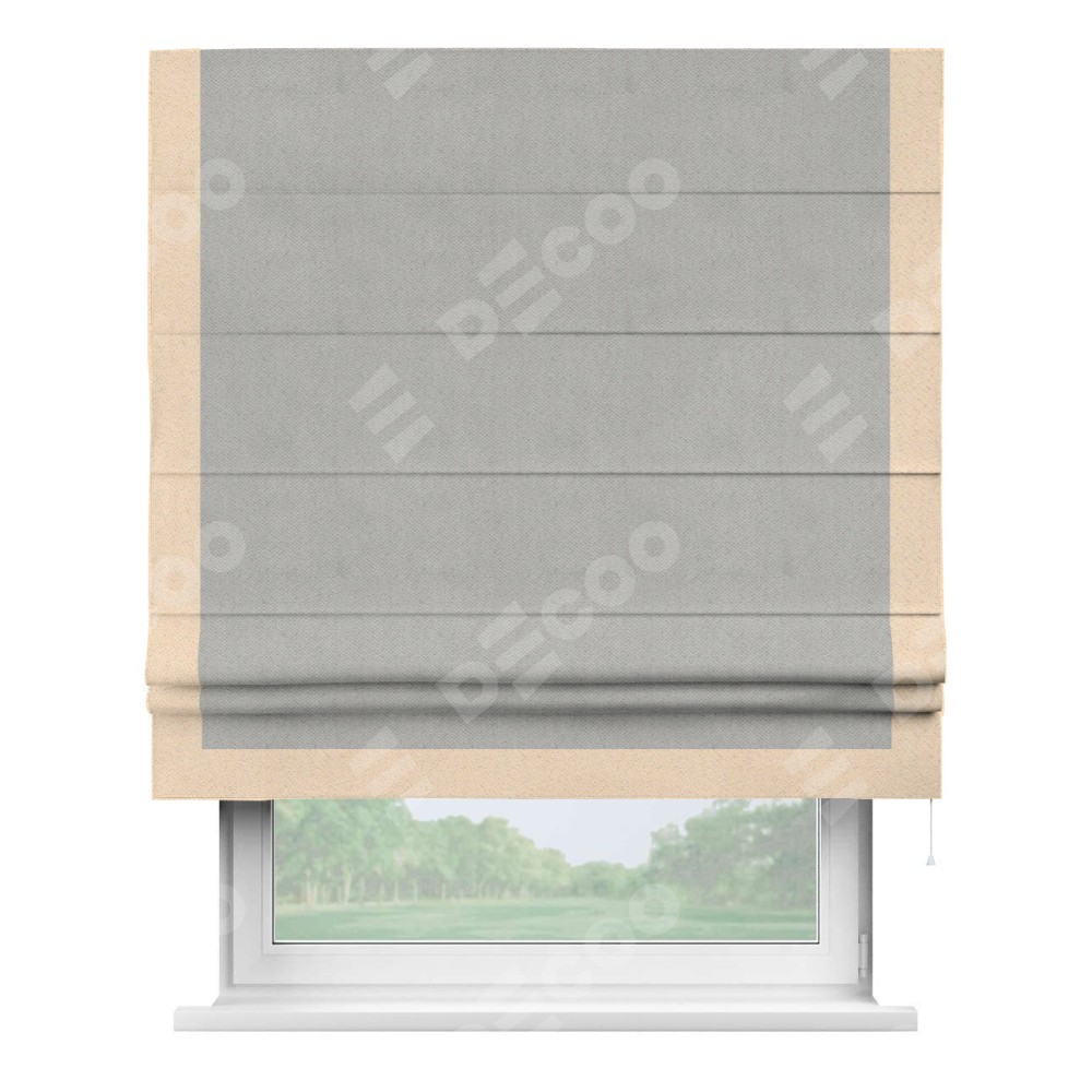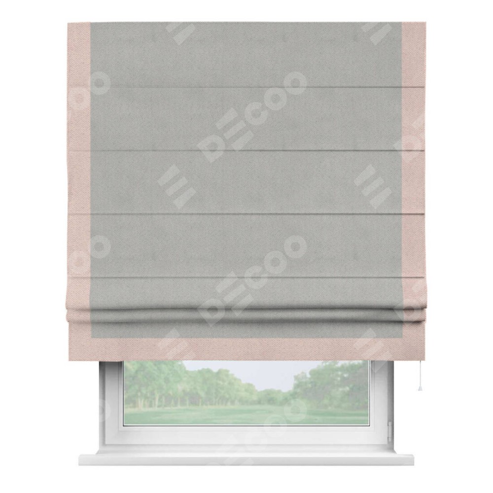 Римская штора производителя «Cortin», используется для проёма, пошита из ткани блэкаут с блеском тёмно-серый, артикул 34634. Отделка шторы кантом «Виктория», ткань для канта используется из блэкаута с блеском разной расцветки на выбор. Изнаночная сторона материала черного цвета, что обеспечивает необходимую светонепроницаемость. Имеет универсальный механизм и подходит для монтажа: на потолок, на стену и в нишу.