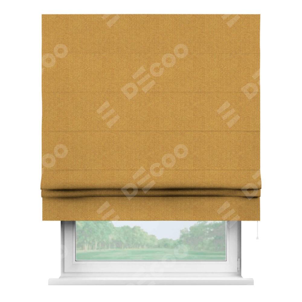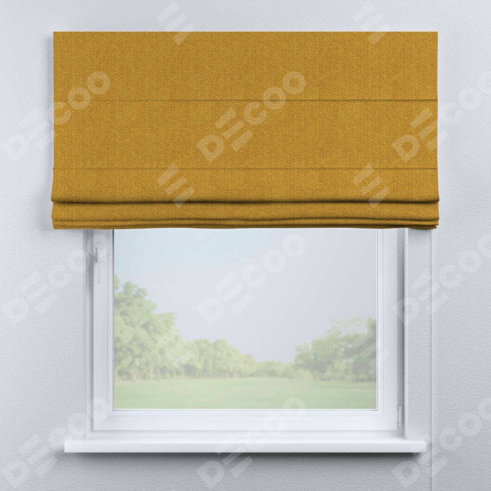 Римская штора производителя «Cortin», используется для проёма, пошита из ткани твид блэкаут медово-желтый, артикул ткани 21641. Имеет универсальный механизм и подходит для монтажа: на потолок, на стену и в нишу.