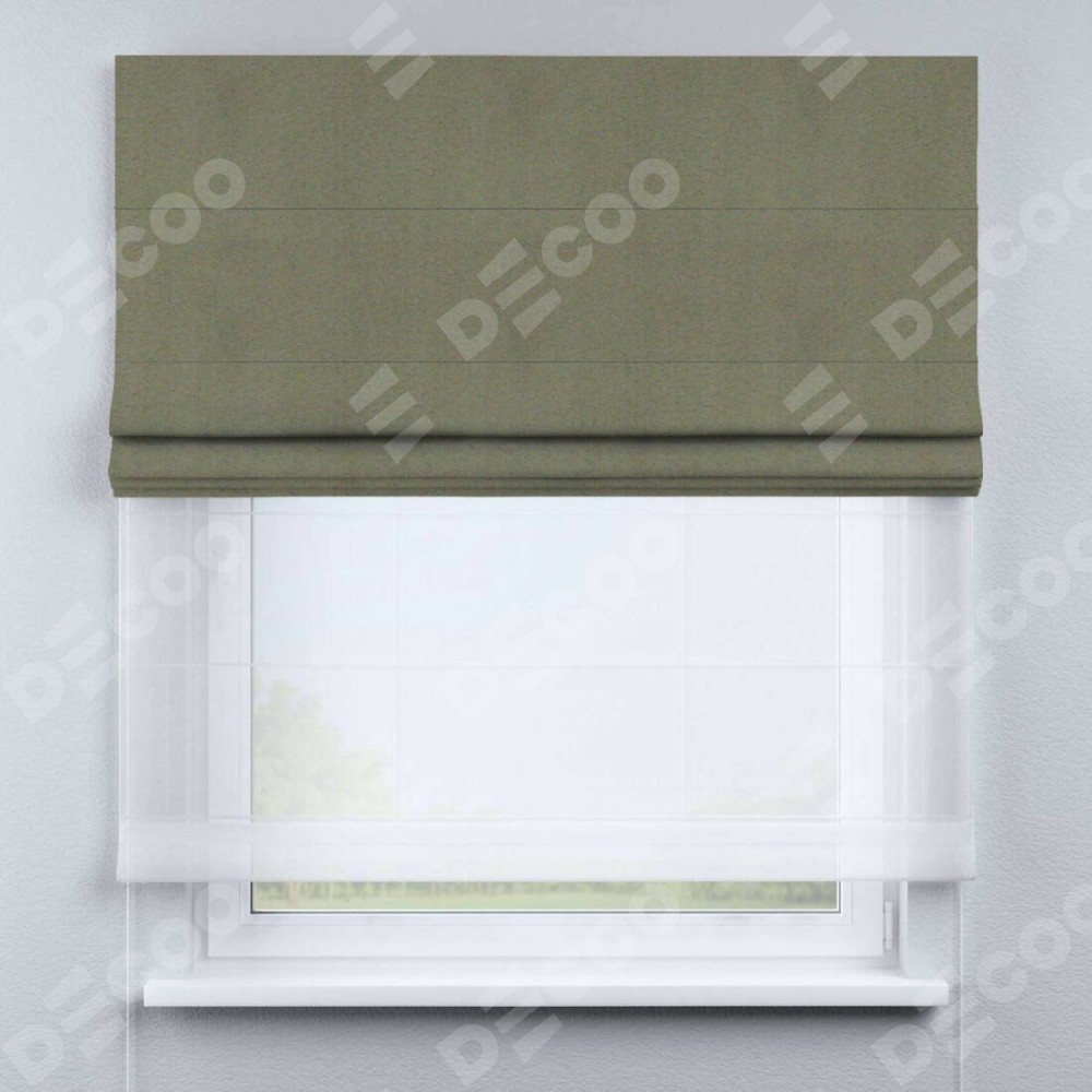 Римская штора день-ночь производителя «Cortin», используется для проёма, пошита из двух полотен, с лицевой стороны блэкаут однотонный серо-коричневый артикул 29568, вторая ткань тюль (по стандарту комплектуется тюль белого цвета артикул V-01). Имеет универсальный механизм и подходит для монтажа: на потолок, на стену и в нишу.