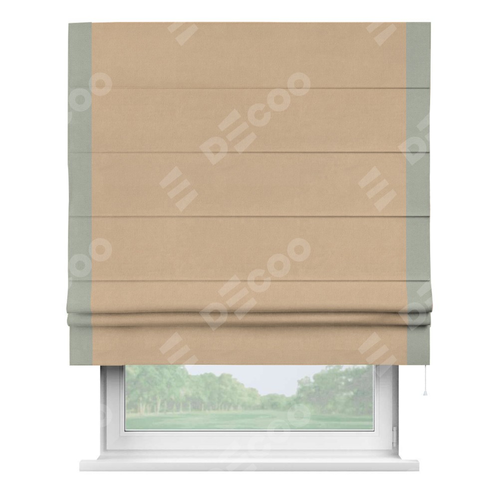 Римская штора производителя «Cortin», используется для проёма, пошита из ткани вельвет песочный, артикул ткани 17740. Отделка шторы кантом «Стрим Дуо», ткань для канта используется из вельвета разной расцветки на выбор. Имеет универсальный механизм и подходит для монтажа: на потолок, на стену и в нишу.