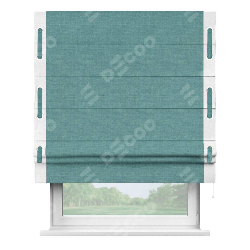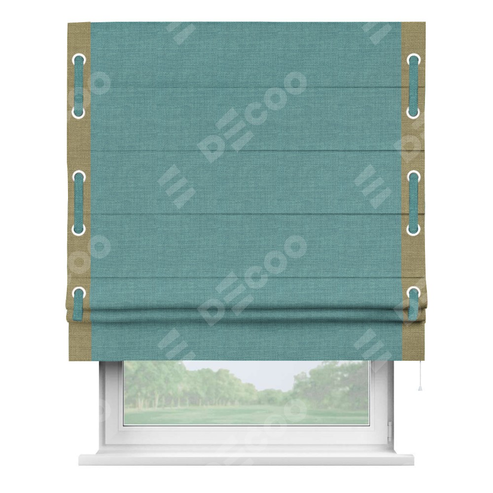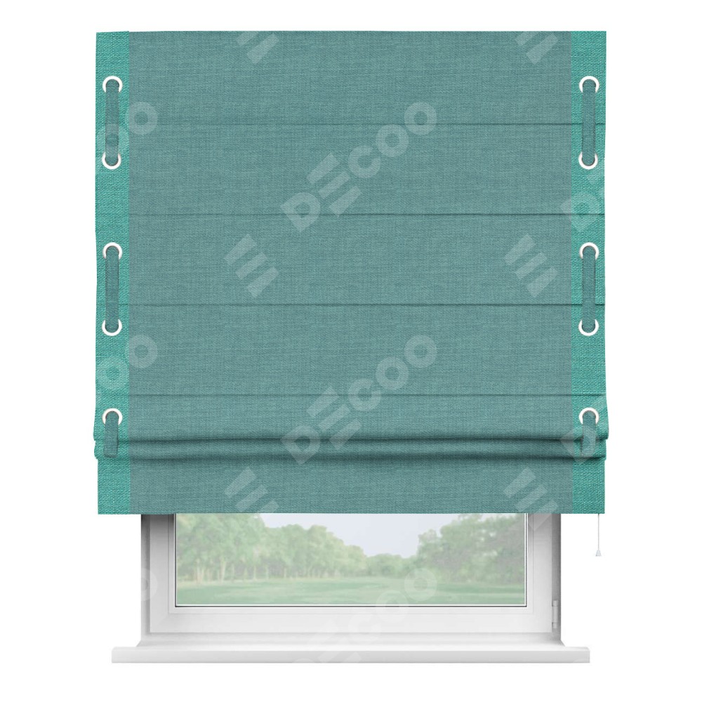 Римская штора производителя «Cortin», используется для проёма, пошита из ткани лён бирюза, артикул 7446. Отделка шторы кантом «Стрим Дуо» на кантах расположены люверсы с пояском, ткань для канта используется из льна разной расцветки на выбор. Ткань для пояска обычно используется из основной ткани шторы, а так же можно сделать из любой расцветки по желанию. Имеет универсальный механизм и подходит для монтажа: на потолок, на стену и в нишу.