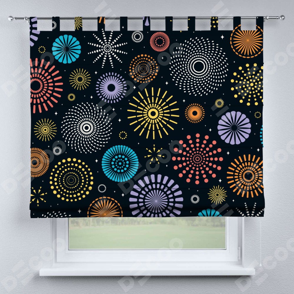 Римская штора производителя «Cortin», используется для проёма, пошита из ткани блэкаут с нанесением сублимационной печати «Праздничный фейерверк». Данная модель пошита на петлях, комплектуется на выбор круглым карнизом и подходит для монтажа на стену. Римская штора на петлях имеет простую систему регулировки высоты, отличительным преимуществом данной модели является простой способ монтажа. Достаточно повесить ее на трубу и штора готова!