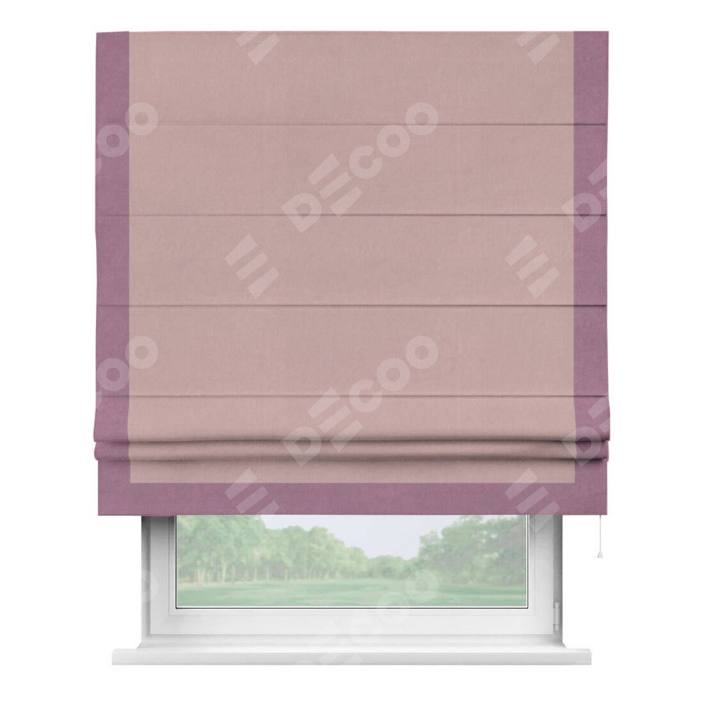 Римская штора производителя «Cortin», используется для проёма, пошита из ткани вельвет розовая пудра, артикул ткани 14132. Отделка шторы кантом «Виктория», ткань для канта используется из вельвета разной расцветки на выбор. Имеет универсальный механизм и подходит для монтажа: на потолок, на стену и в нишу.