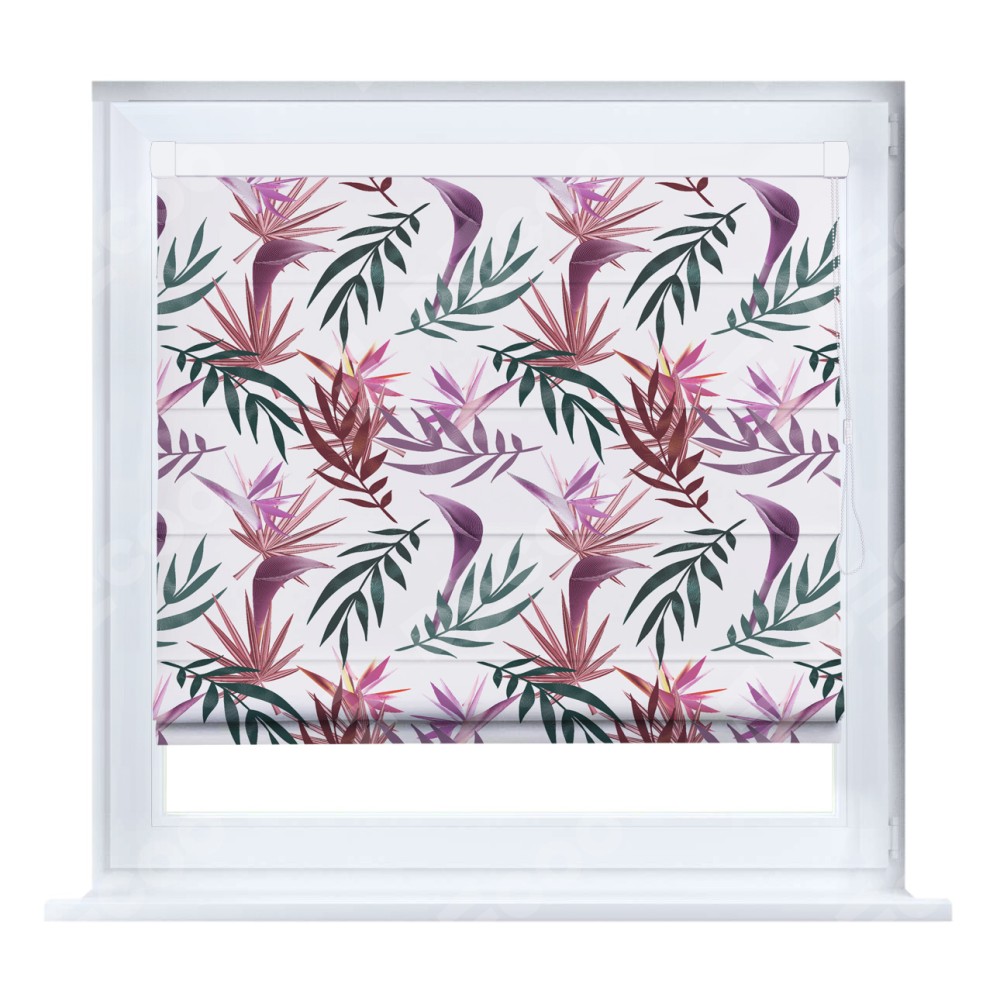 Римская штора производителя «Cortin», устанавливается на створку окна, пошита из ткани блэкаут с нанесением сублимационной печати «Тропические побеги». Штора шьётся по индивидуальным размерам, для данного типа римской шторы возможная ширина от 35 до 150 см., высота до 250 см.