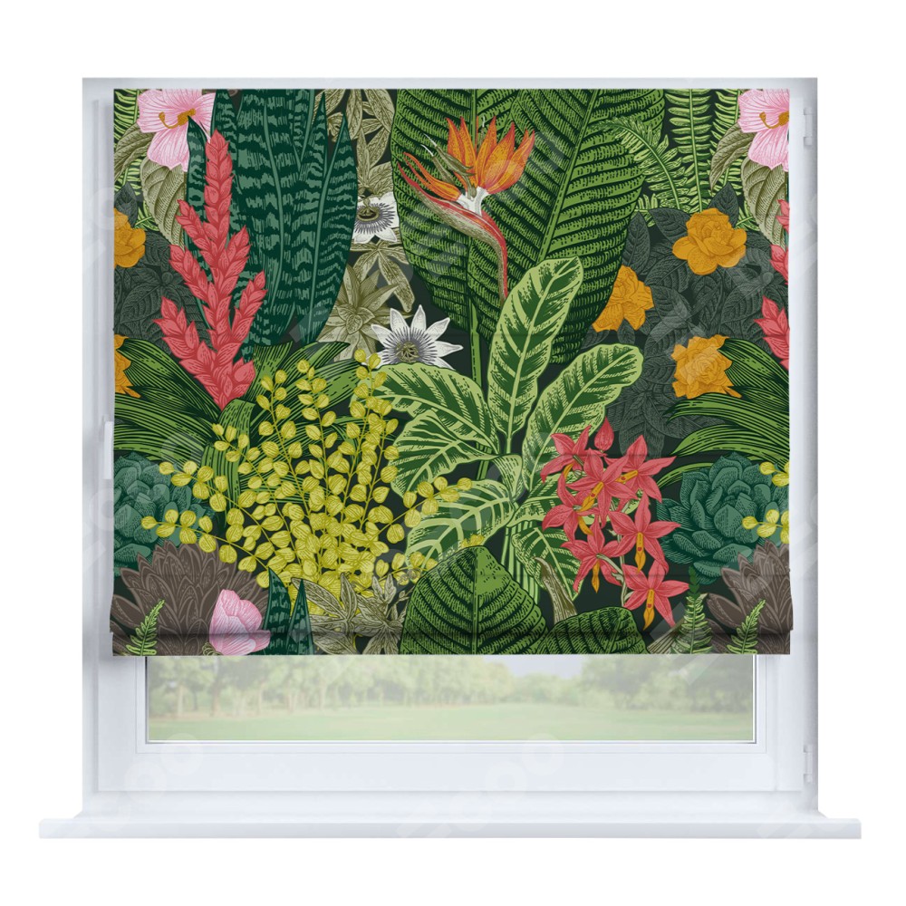 Римская штора производителя «Cortin», устанавливается на створку окна, пошита из ткани блэкаут с нанесением сублимационной печати «Яркое цветение». Штора шьётся по индивидуальным размерам, для данного типа римской шторы возможная ширина от 35 до 150 см., высота до 250 см.